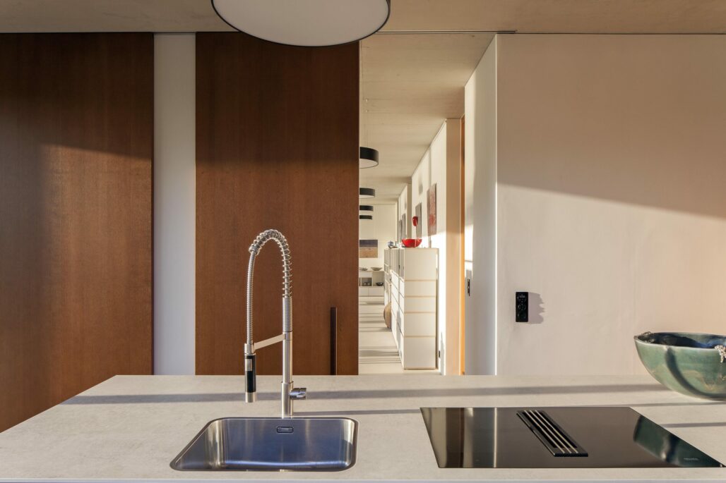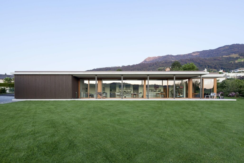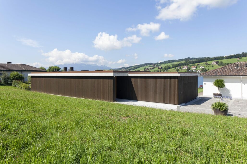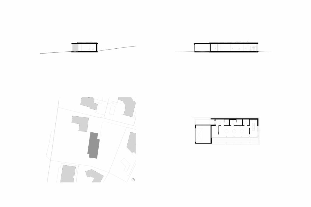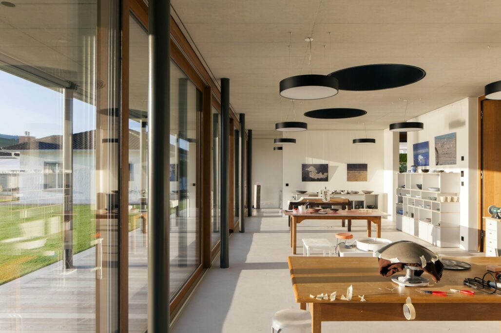 Auf einem grosszügigen Grundstück mit Seeanstoss ergänzt ein Nebenbau die Gesamtanlage mit Hauptgebäude und Gartenanlage. Das eingeschossige Gebäude dient der Bauherrschaft als Atelier für ein Kunsthandwerk. Die Lage des Gebäudes wurde so gewählt, dass er seeseitig zusammen mit dem Bestand einen gut proportionierten Aussenraum umfasst. Die geschlossene Fassade gegen den Zugang gewährt die gewünschte Privacy. Sämtliche rückwärtigen Räume sind ausschliesslich über Oberlichter geöffnet. Die grossen und runden Öffnungen im Atelierraum ergeben eine für das Kunsthandwerk ideale zenitale Belichtung. Die Materialisierung zeigt sich sehr reduziert: Fenster, Türen und die fest eingebauten Möbel sind aus geölter Roteiche, der Boden ist mit einem Zementspachtel behandelt, die Decken Sichtbeton.