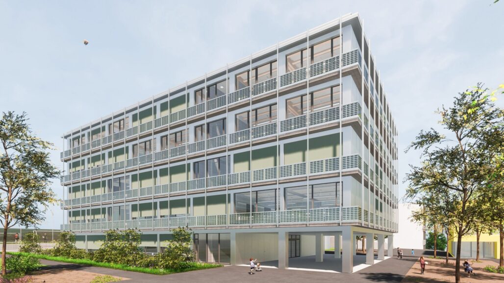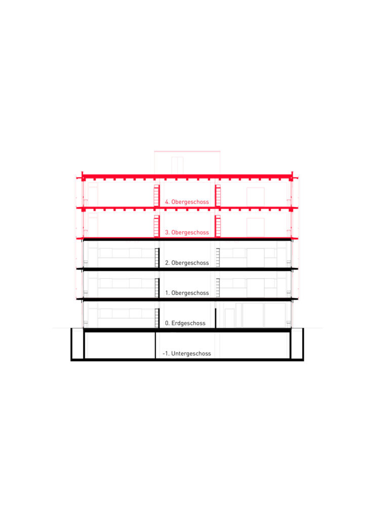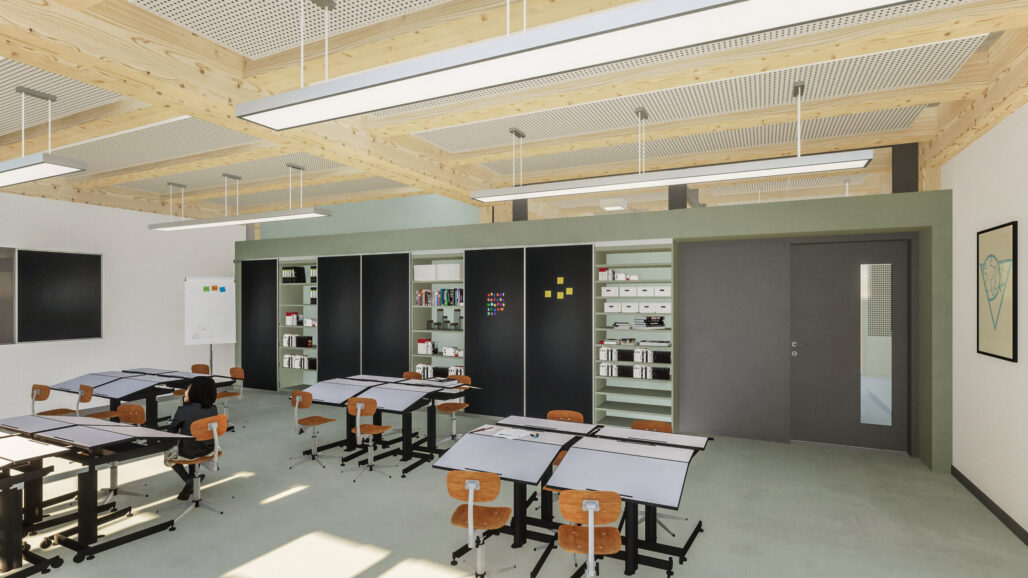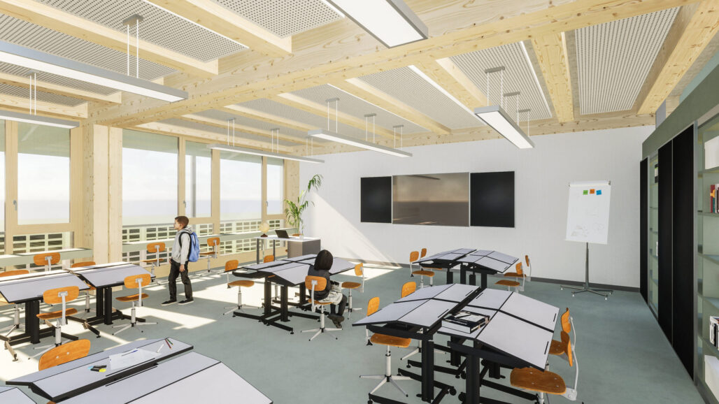 Das bestehende Schulgebäude Sunnegrund 5 mit Baujahr 2002 wird um zwei Vollgeschosse in Holzbauweise aufgestockt. Dies schafft insgesamt 12 zusätzliche Klassenzimmer und die entsprechenden Gruppenräume. Die Grundrisstypologie wird in den neuen Geschossen weitergeführt und ermöglicht damit ein statisches System mit einfachem, vertikalem Lastabtrag. Auch die Vertikalerschliessung, die technischen Leitungen und die Anordnung der Nasszellen werden am gleichen Ort im Grundriss nach oben geführt. Am Ort der bestehenden Haupterschliessung wird eine neue, doppelläufige Treppenanlage die nötige Erschliessungskapazität bringen. Da die Treppe gegen den Erschliessungskorridor zu den Klassenzimmern abgetrennt wird, verlieren diese Bereiche ihre Fluchtwegfunktion und können von der Schule flexibel genutzt werden. Um den grossen Schülerstrom ins Schulhaus zu bewältigen, sind gegen die gedeckte Pausenhalle neu zwei Eingänge geplant. Im Zuge der Aufstockung sollen auch Unzulänglichkeiten auf den bestehenden Geschossen verbessert werden, insbesondere sind die klimatischen Bedingungen aus der Sicht der Schule suboptimal und müssen verbessert werden, im Sommer ist es zu heiss, im Winter zu kalt. So wird die ganze Fassade erneuert, welche Dank Solargläsern auch Strom produziert.
