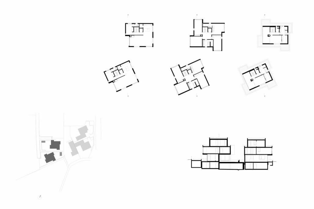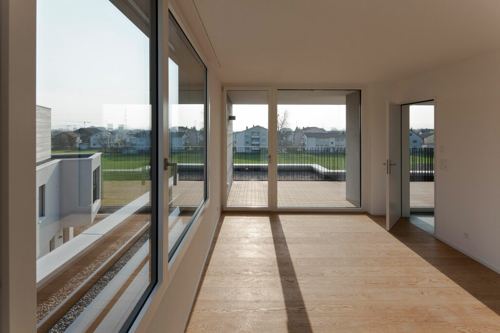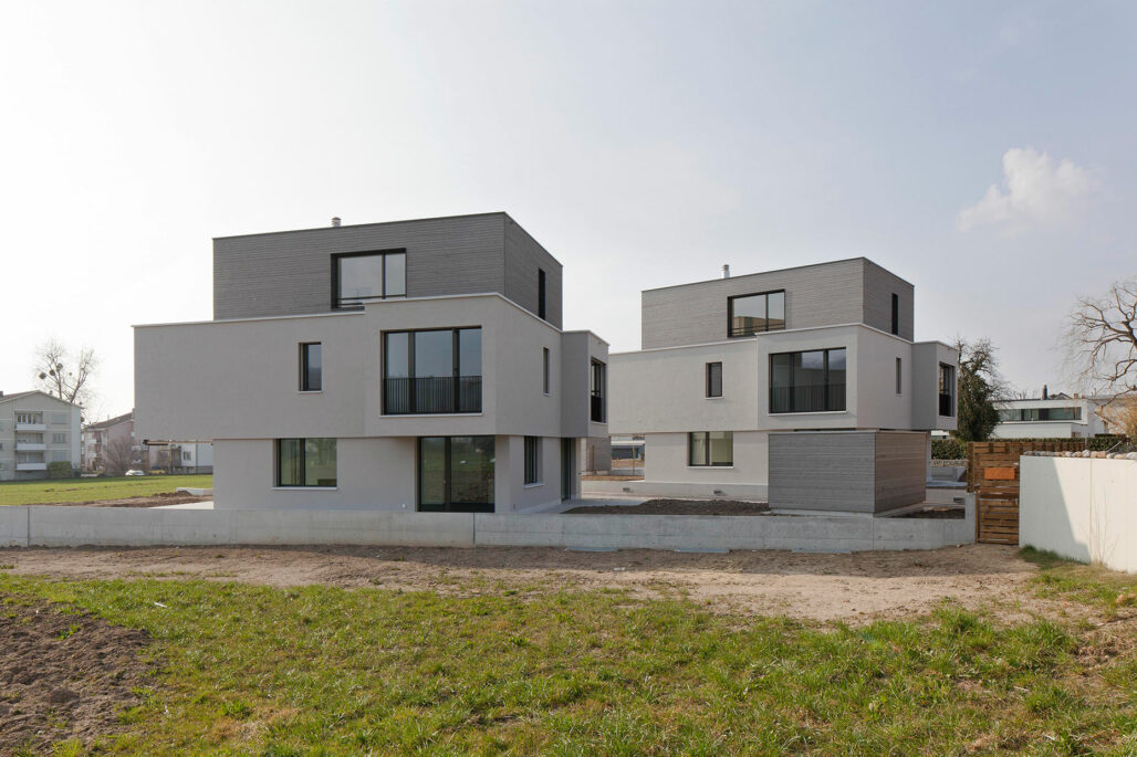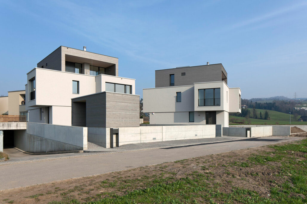 Die beiden gleichen Einfamilienhäuser sind zueinander leicht verschoben und gedreht angeordnet um, trotz des eher geringen Abstands zueinander, die gegenseitige Einsicht zu minimieren und eine maximale Privatsphäre zu schaffen. Die Häuser beinhalten ein grosszügiges Raumprogramm mit 6.5 Zimmern und sind über das Treppenhaus und Lift mit der unterirdische Autoeinstellhalle verbunden.