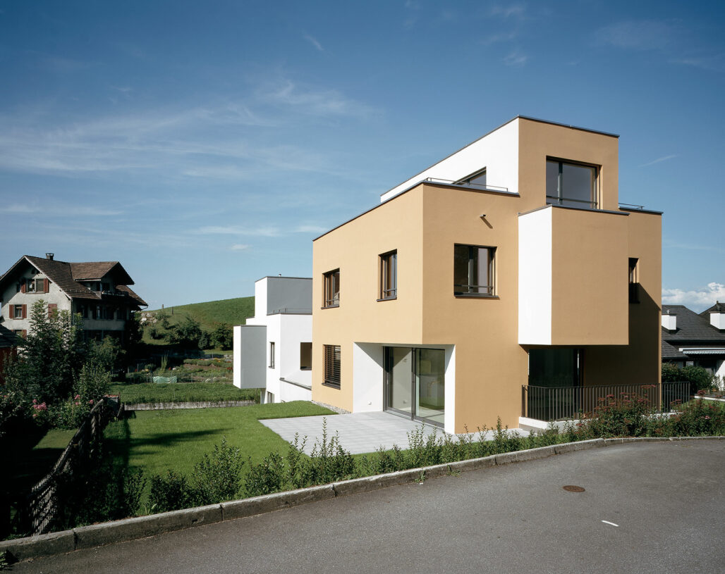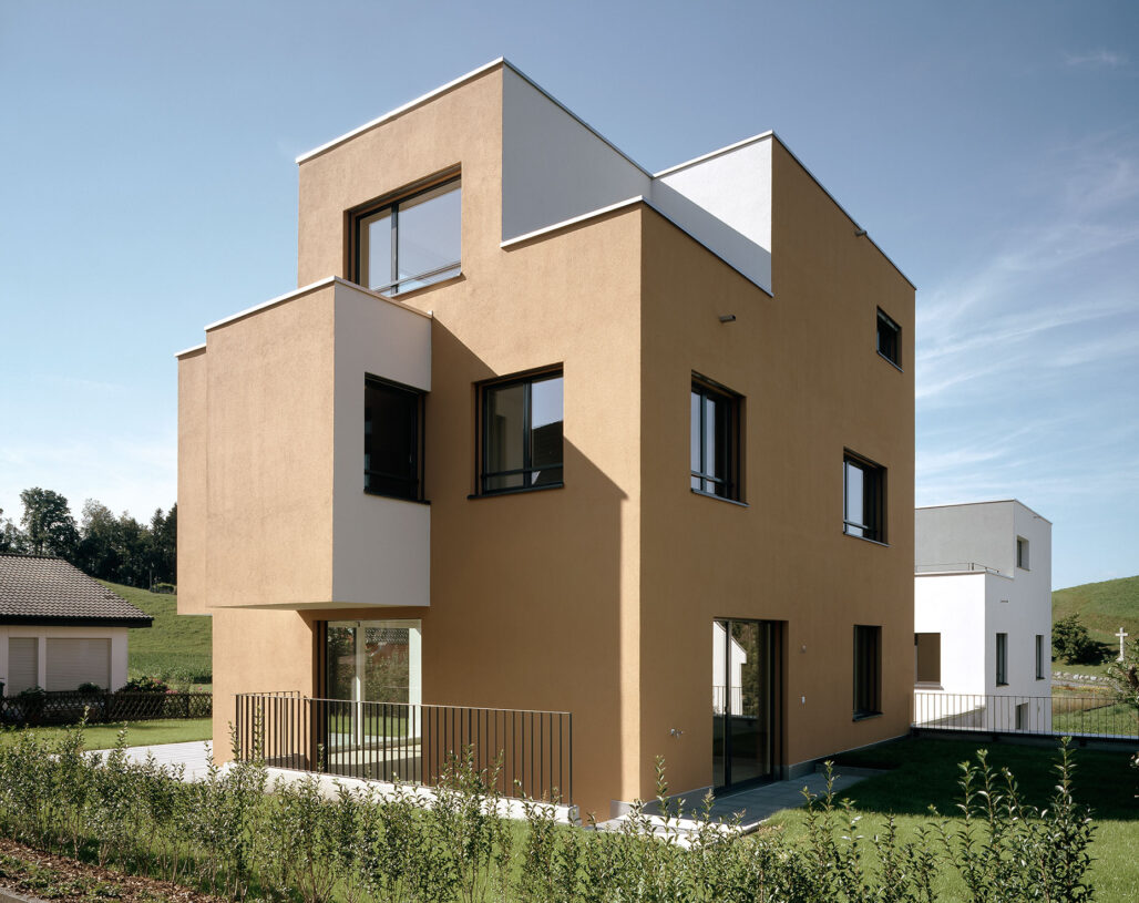 In einem heterogenen Einfamilienhausquartier am Dorfrand von Neuheim, an der Siedlungsgrenze zur Landwirtschaft galt es zwei Einfamilienhäuser für den Verkauf zu planen. Dem Terrainverlauf entsprechend sind die beiden Häuser um ein Geschoss in der Höhe versetzt, damit die zugehörigen Aussenräume genügend Privatsphäre aufweisen. In einem heterogenen Einfamilienhausquartier am Dorfrand von Neuheim, an der Siedlungsgrenze zur Landwirtschaft galt es zwei Einfamilienhäuser für den Verkauf zu planen. Dem Terrainverlauf entsprechend sind die beiden Häuser um ein Geschoss in der Höhe versetzt, damit die zugehörigen Aussenräume genügend Privatsphäre aufweisen.