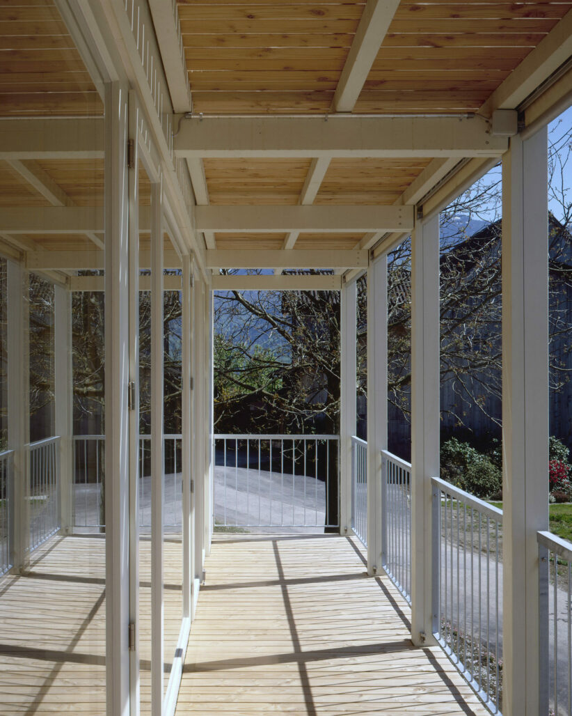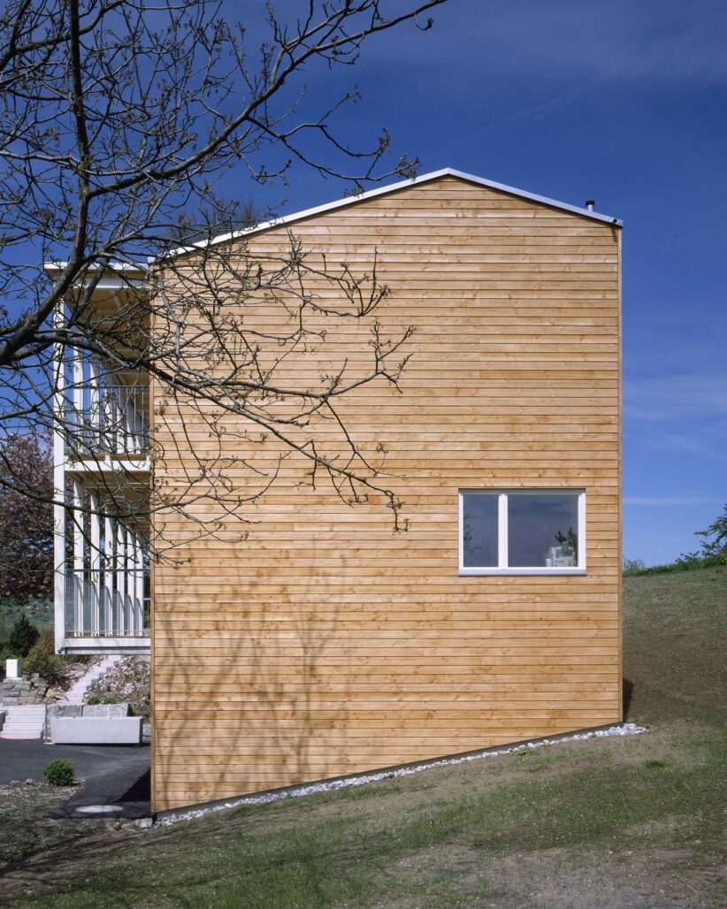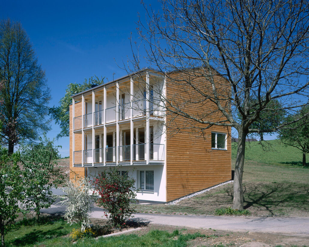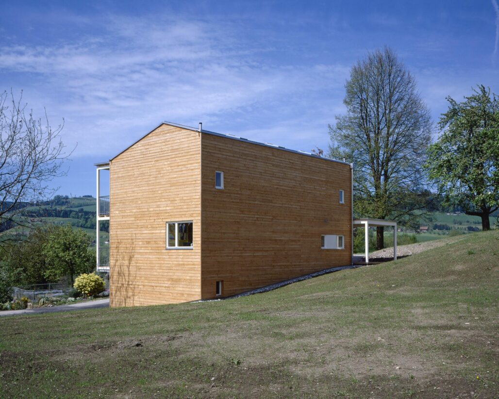 Der einfache kubische Bau ersetzt in der Landwirtschaftszone ein kleineres Wohngebäude und bildet mit dem bestehenden angrenzenden Stall neu das Gehöft. Material und Gestaltungselemente werden aus der traditionellen ländlichen Architektur übernommen und auf zeitgemässe Art und Weise umgesetzt.