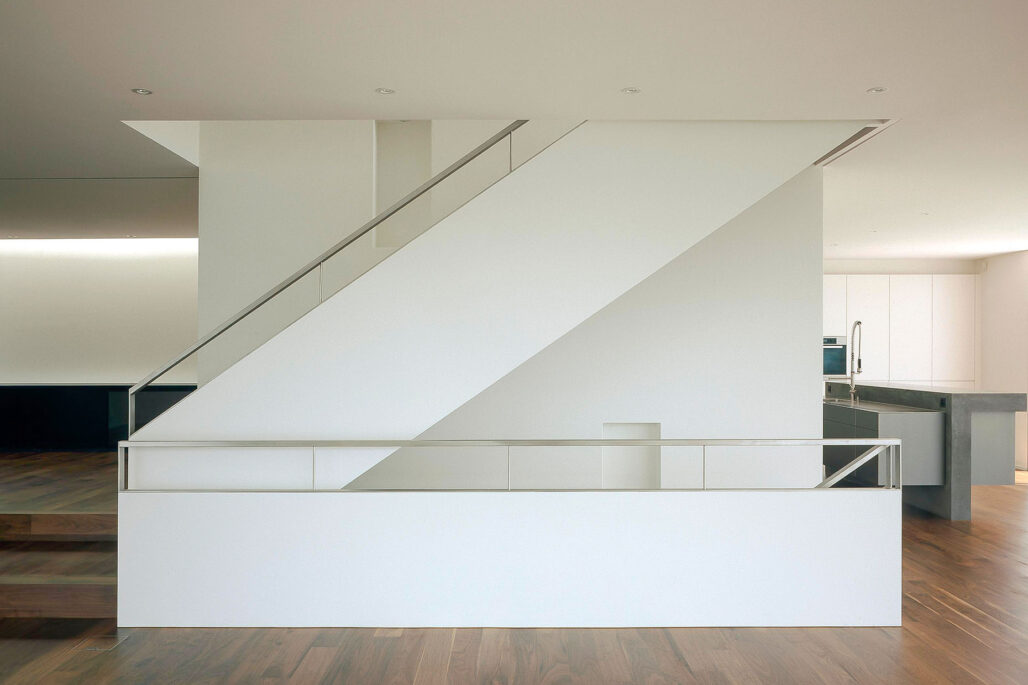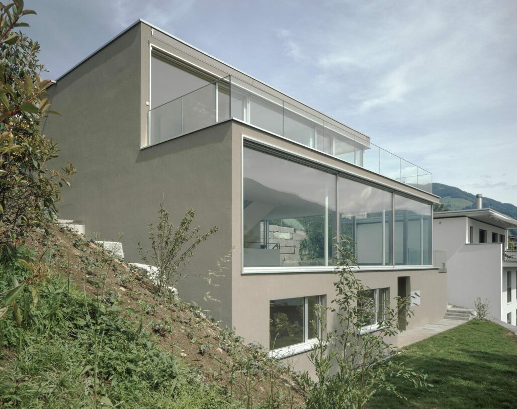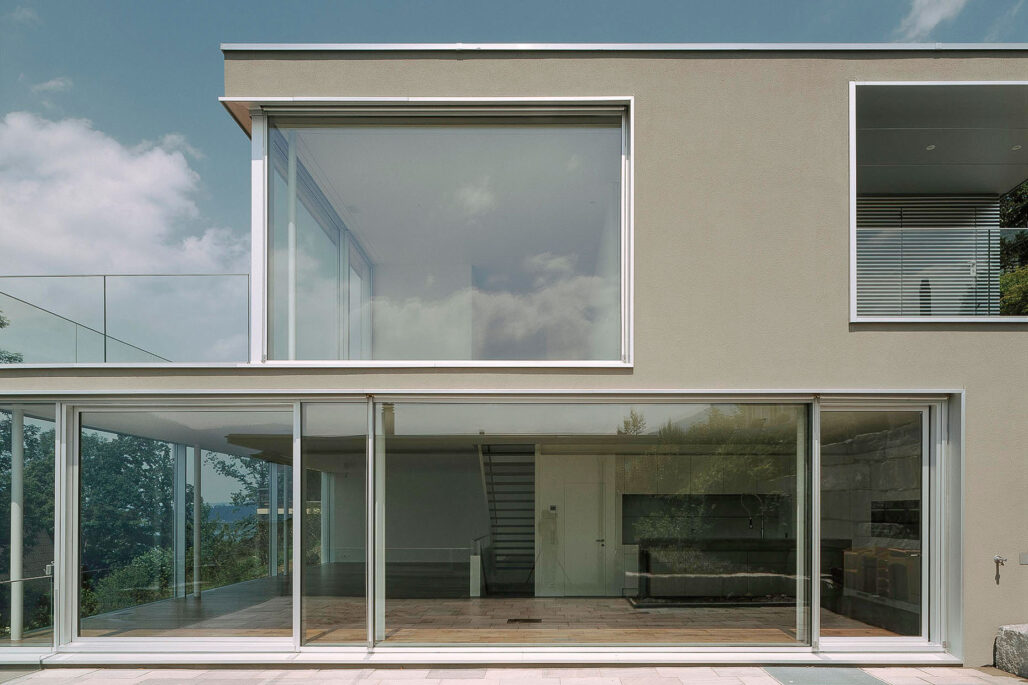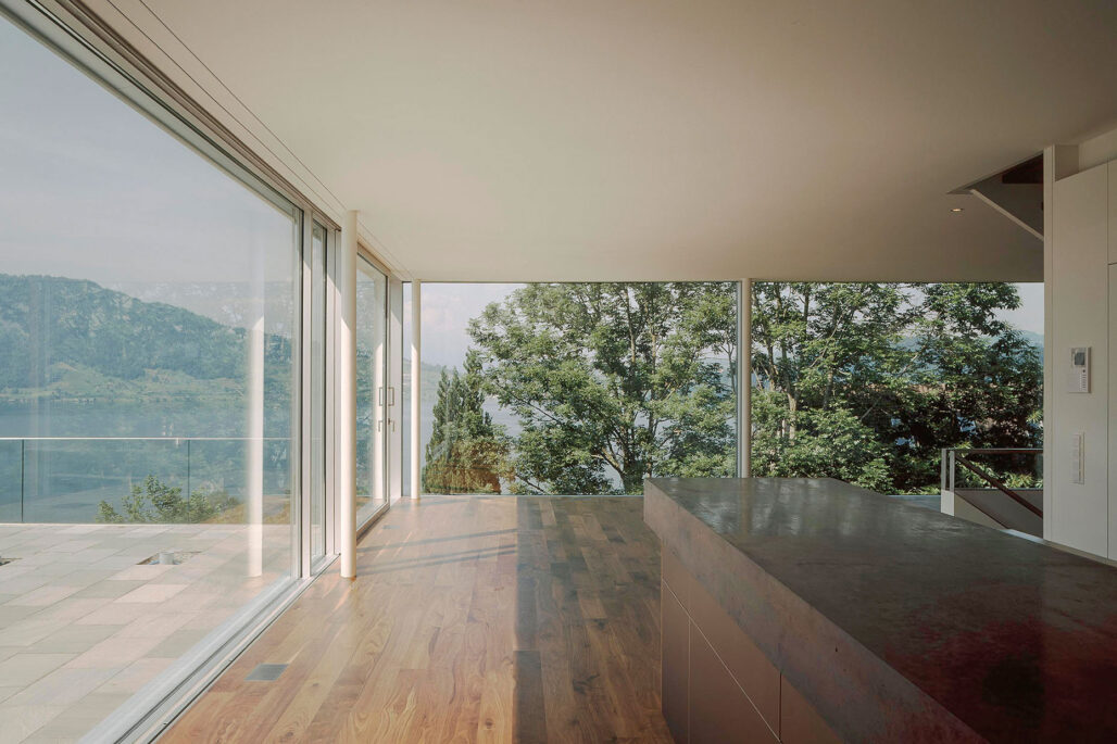 Das sehr grosszügige Einfamilienhaus liegt an aussichtsreicher Hanglage. Der unmittelbare Bezug von Innen und Aussen und die freie Sicht auf den See bilden die zentralen Entwurfsgedanken. Eine Pfosten-Riegel-Konstruktion der Fensterfronten ermöglicht eine vollständige Verglasung von Boden bis Decke. Aussen werden die Fenster durch umlaufende Aluprofile gefasst, welche bewusst zum hellen Beige des Aussenputzes kontrastieren. Innen verleiht der dunkle Holzboden den Räumen eine angemessene Ruhe.