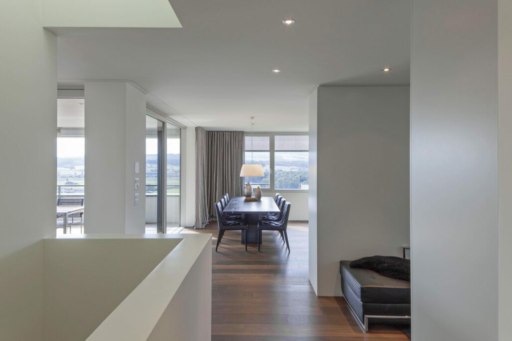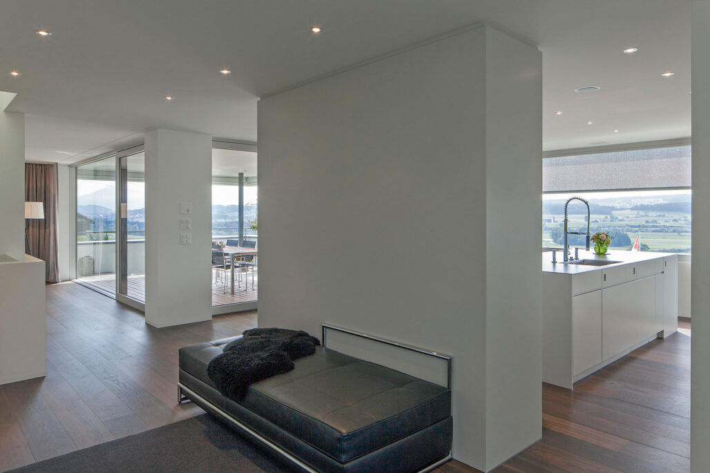 An aussichtsreicher Lage an der Sonnhalde in Hünenberg ersetzt das grosszügige Einfamilienhaus ein einfaches Gebäude aus den 70er Jahren. Auf einem deutlich ausgezeichneten Sockel kragt das Eingangsgeschoss allseitig aus. Die zenitale Belichtung des Erschliessungsbereiches im Zentrum des Grundrisses verbindet beide Geschosse. Die hochwertige Materialisierung im Innern widerspiegeln die hohen Ansprüche an das Wohnen.