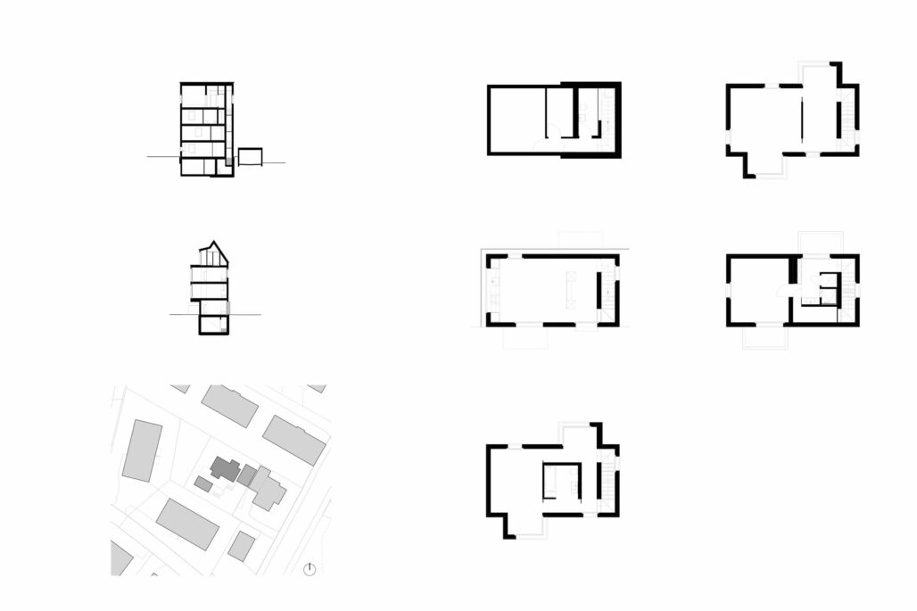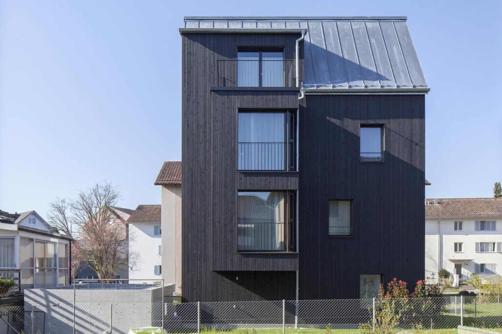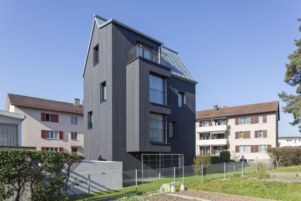 Das Raumprogramm des zu planenden Einfamilienhaus muss auf sämtliche zulässigen fünf Geschosse verteilt werden und verleiht dem Gebäude einen turmartigen Ausdruck. Die dunkle prägnante Holzfassade verstärkt seinen ungewöhnlichen volumetrischen Ausdruck damit sich das Haus im Umfeld der deutlich grösseren Gebäudevolumen behaupten kann.