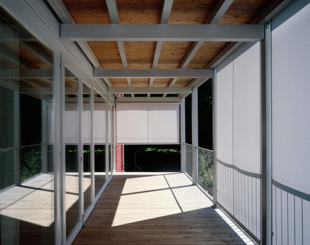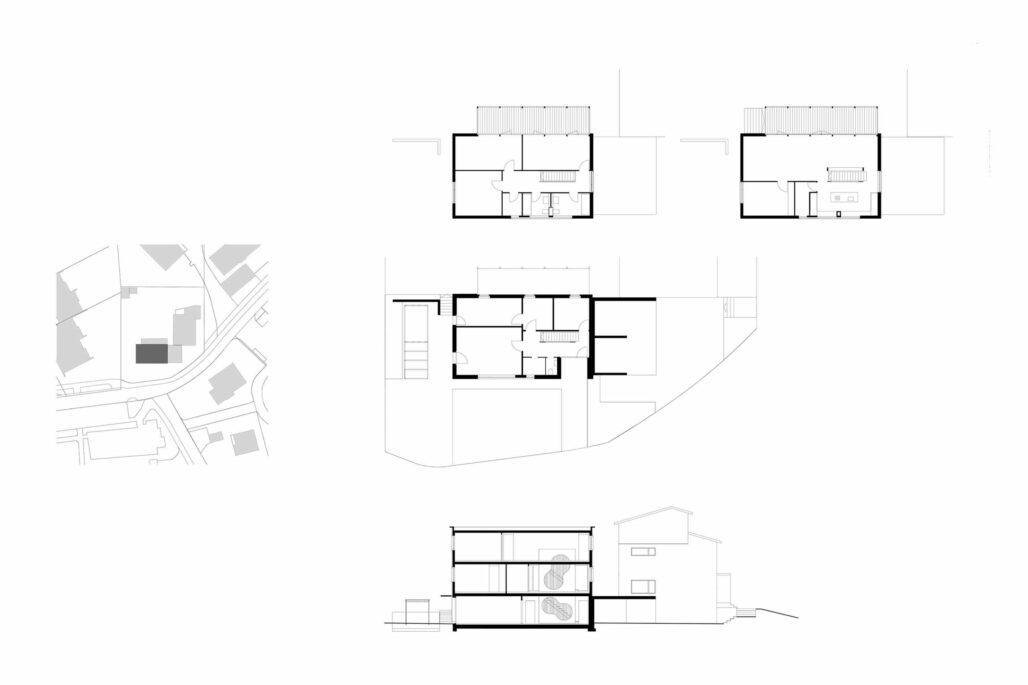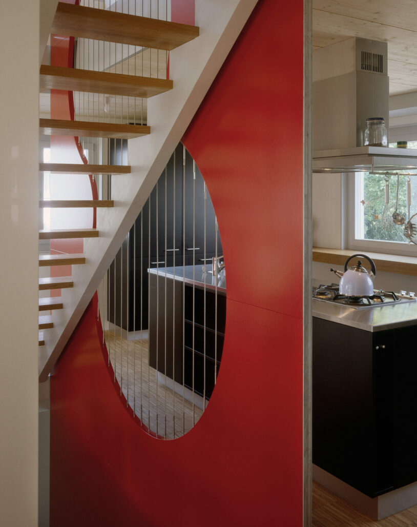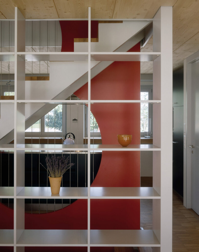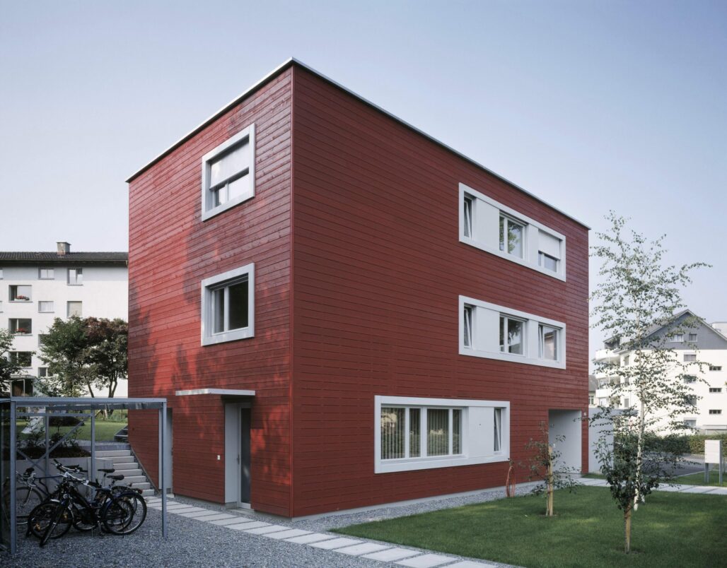 An prominenter Zentrumslage in Rotzkreuz fällt das rote Holzhaus durch seine zeitgemässe Architektur auf. Der Holzbau beherbergt Praxis- und Nebenräume im Erdgeschoss sowie die Wohnräume in den beiden Obergeschossen. Der halbgeschossige Geländesprung wird auf der Südseite für einen direkten Abgang von der Veranda her genutzt. Auf der Strassenseite zeichnen die metallgerahmten Bandfenster das Gesicht des Baus.