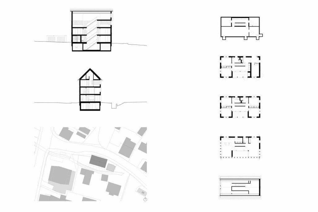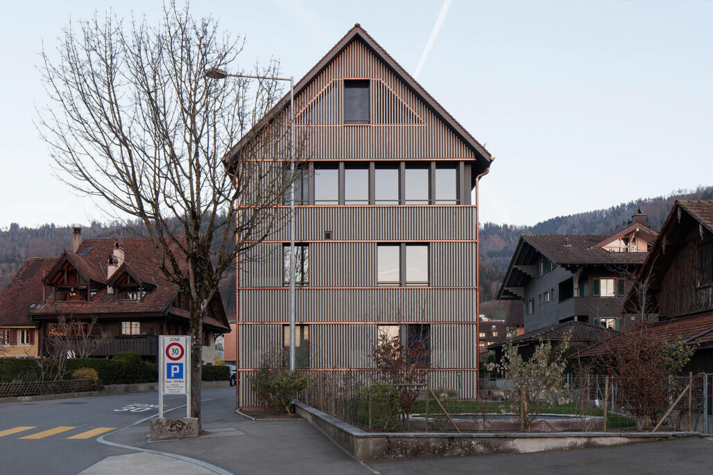 In der Ortsbildschutzzone von Oberwil bei Zug, auf einem schmalen Grundstück zwischen der Widenstrasse und dem Mülibach, steht der Ersatzbau in mitten eines weitgehend öffentlichen Raumes. Der schlanke und elegante Baukörper steht im Dialog zu den umliegenden geschützten Bauten. Das Volumen spielt mit den traditionellen Gestaltungsmitteln Satteldach, Lochfenster, Läden und Lauben. Die horizontale Gliederung unterscheidet zwischen Brüstungsband und Fenster-Schiebelädenband. Das Gebäude integriert sich damit in den Bestand, ohne sein zeitgemässes Bild zu verleugnen.