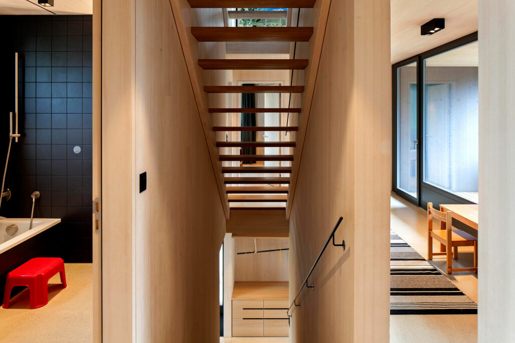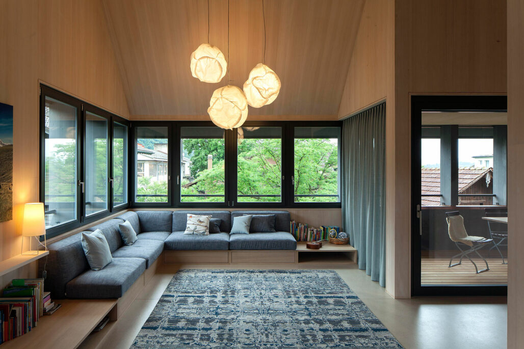 Das Gebäude ist mit Innerschweizer Mondholz im System Holzpur ausgeführt. Die 180 mm starken, massiven Holzwände sind aussen mit einer ebenso starken Holzfaserplatte gedämmt und mit einer vertikalen Holzschalung verkleidet. Im Inneren sind die perfekt verarbeiteten und weitgehend astfreien Wände gegen das Nachdunkeln leicht geseift und wirken dadurch luftig und leicht.