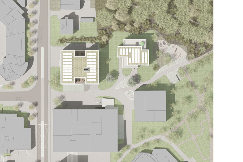 Als zweite Etappe des 2017 festgelegten Bebauungsplans Maihölzli sind auf dem Baufeld D das neue Gemeindehaus, auf Baufeld E ein Gebäude mit Wohnungen nach dem Wohnraumförderungsgesetz (WFG) und einer Gewerbenutzung im Erdgeschoss und eine entsprechende Tiefgarage geplant. Das neue Verwaltungsgebäude besetzt den Strassenraum an der Chamerstrasse und soll einen eigenständigen Ausdruck bekommen, um sich seiner öffentlichen Nutzung entsprechend vom südlich gelegenen Wohn- und Gewerbegebäude zu unterscheiden. Das Wohngebäude am Waldrand besitzt einen ganz anderen Charakter und vermittelt zwischen Natur und Siedlung. Wie im Bebauungsplan festgelegt sorgt eine differenzierte Gestaltung der Volumina im Dachbereich dafür, dass sich die unterschiedlich grossen Baukörper in den Kontext einfügen und untereinander harmonieren. Die Gemeinde als Bauträger hat sich dazu entschieden, die beiden Gebäude als Holzbauten zu planen.