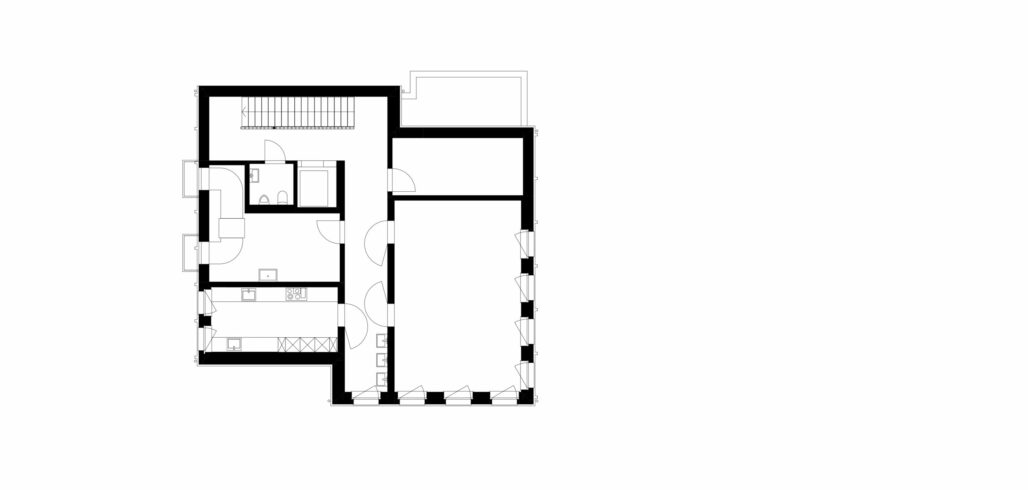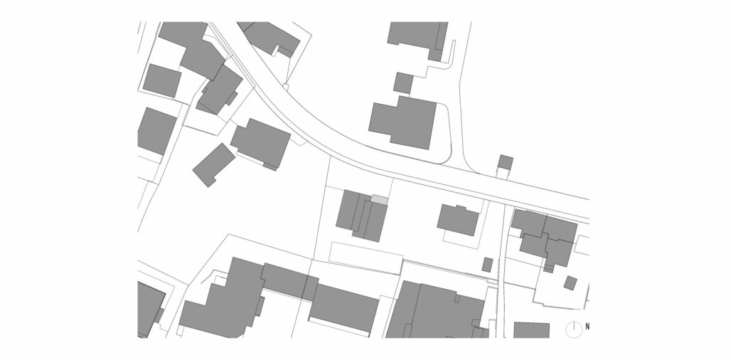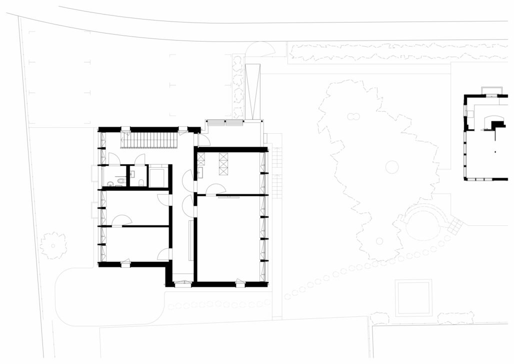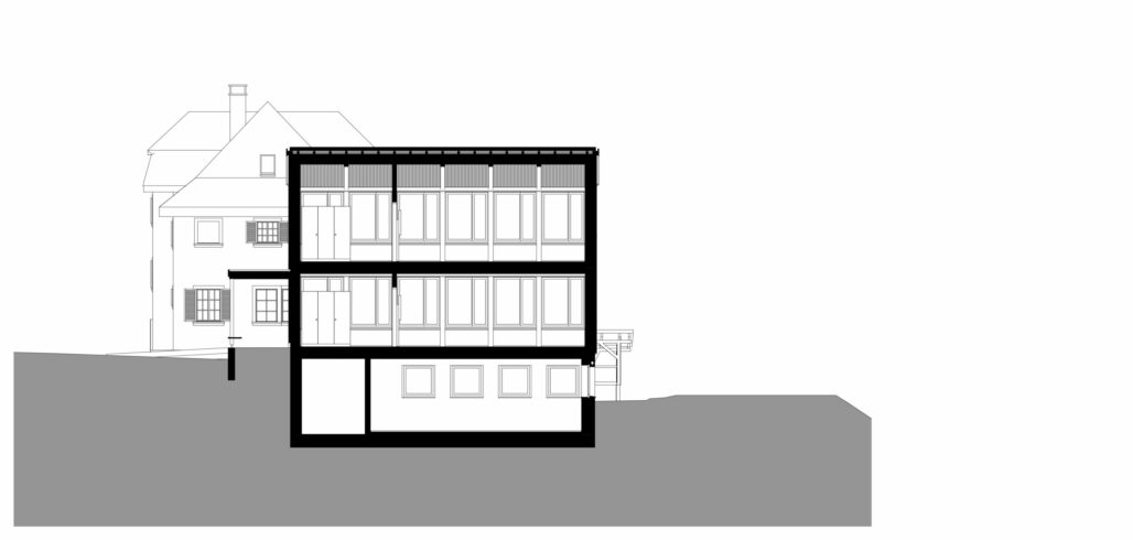 Das neue Gebäude ist in einen parkähnlichen Freiraum gesetzt und nimmt einen respektvollen Abstand zu den umliegenden, denkmalgeschützten Bauten entlang der Mitteldorfstrasse ein. Die Umgebung, die sich hinter der Einfriedung zwischen dem Neubau und der historischen Villa aufspannt, ist von einem alten Baumbestand geprägt. Dieser Charakter bleibt durch eine zurückhaltende Umgebungsgestaltung und angepasste Bepflanzungen weitgehend bestehen. Die Parkierung wird dem Neubau vorgelagert, so dass ein grosszügiger Vorplatz entsteht, von wo eine Rampe zur leicht erhöhten Pausenhalle und zum Eingang führt.