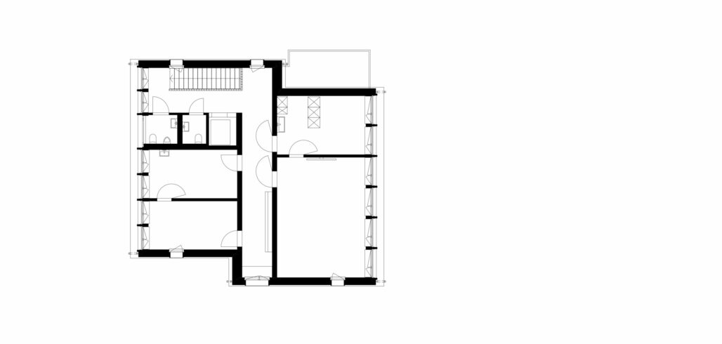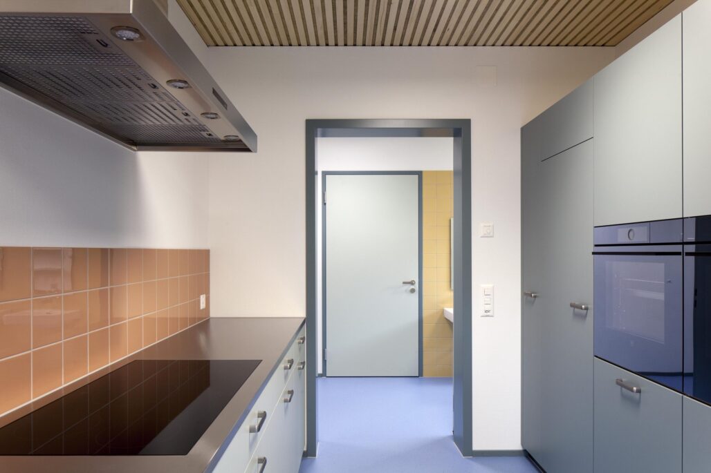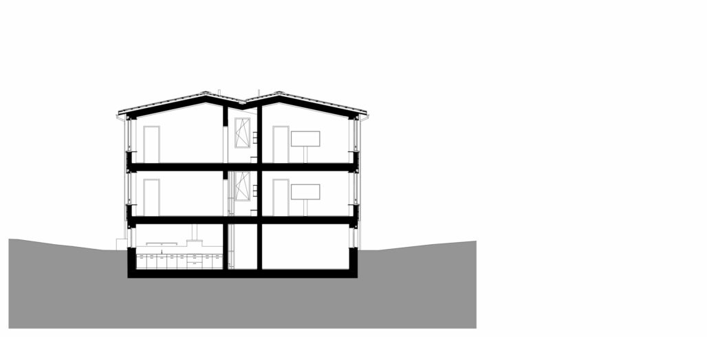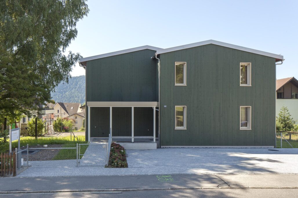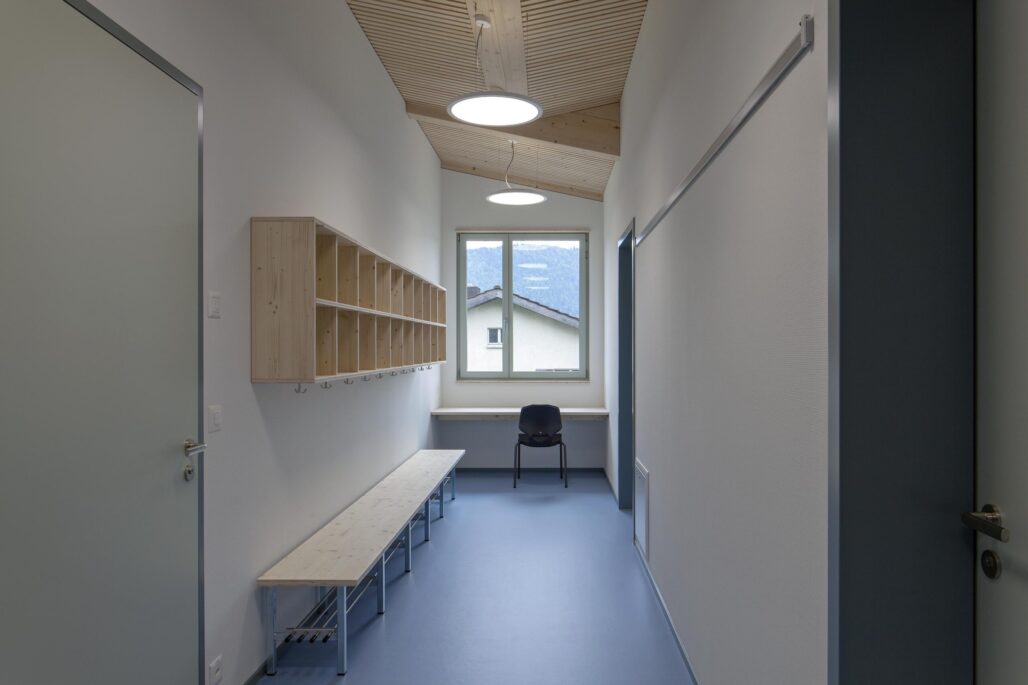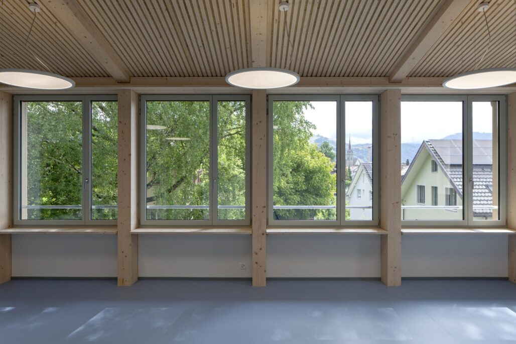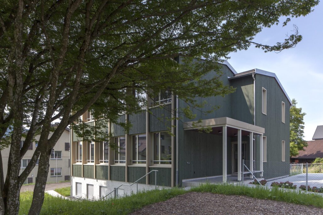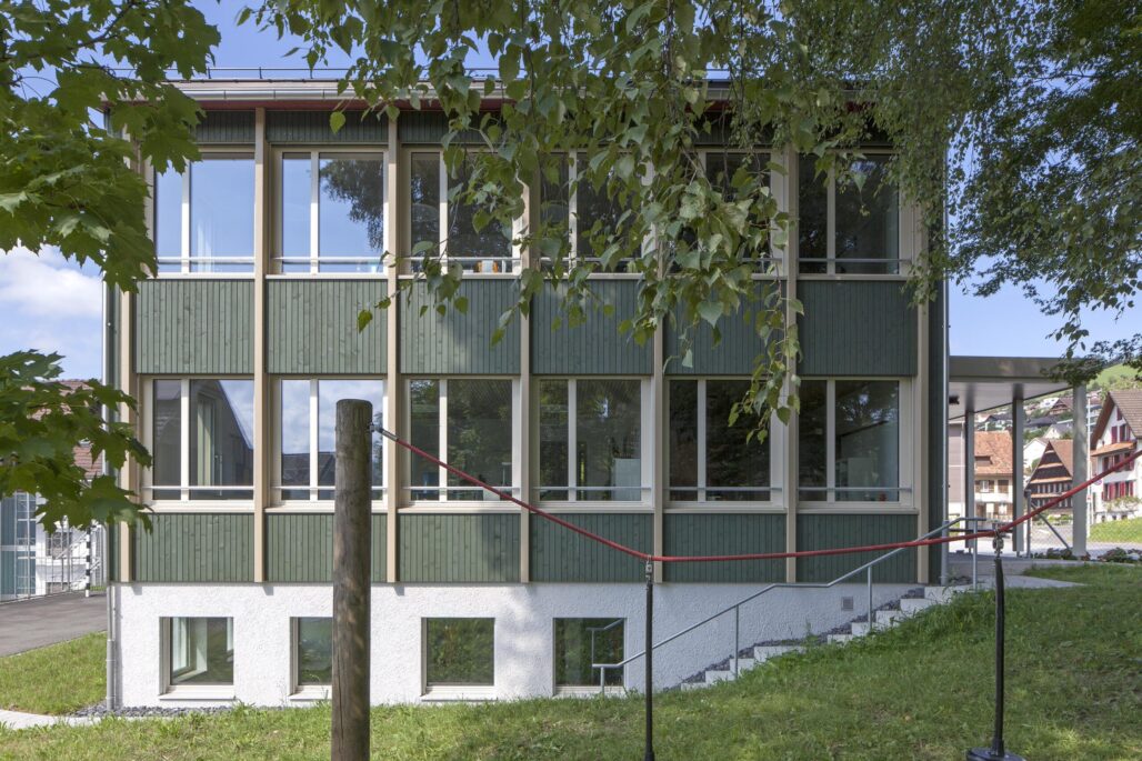 Das Gebäude ist durch einen zentralen Korridor in zwei Hälften gegliedert. Die beiden Gebäudehälften sind wiederum entlang zweier statischer Raster organisiert, wobei eines regelmässig und eines unregelmässig angeordnet ist. Diese Organisation erlaubt es, mit einer differenzierten Grundrissgestaltung auf das geforderte Raumprogramm zu reagieren. Dabei werden die Bedürfnisse einer modernen Schule und die Anforderungen an einen zeitgemässen Unterricht optimal umgesetzt. Der Versatz im Gebäudevolumen wird zusätzlich durch die Ausformulierung des Dachs unterstützt und führt zu einer im Massstab angepassten Wahrnehmung des Schulbaus. Die leichte Hanglage ermöglich es, das Untergeschoss ins Terrain abzusenken, trotzdem eine gute Belichtung in den Innenräumen zu bewahren und das Gesamtvolumen auf einer angepassten Höhe zu halten. Einer optimalen Orientierung eines Schulbaus entsprechend, sind die Nord- und Südfassaden weitgehend geschlossen gestaltet, während die Ost- und Westfassaden von weitläufigen Fensterflächen geprägt sind. Die hölzerne Materialisierung der Gebäudehülle orientiert sich an den umliegenden Bauten und verweist durch seine zurückhaltenden Farbtöne dennoch auf die Nutzung des Hauses.
