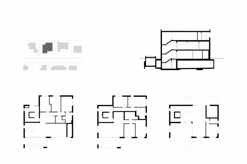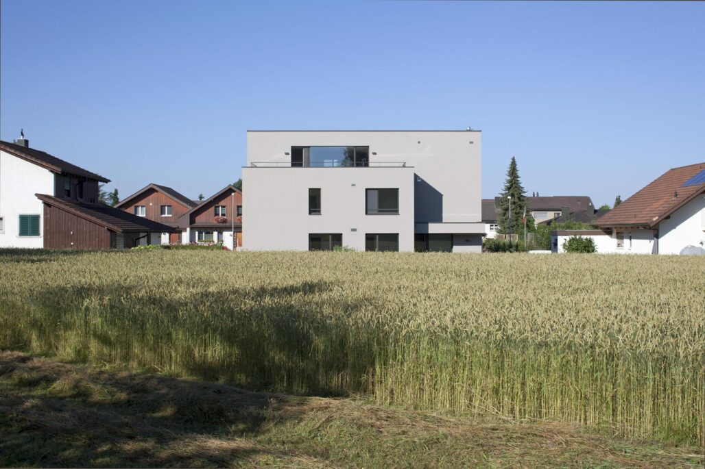 An der Siedlungsgrenze in Baar beabsichtigte eine Familie ein Dreifamilienhaus zu realisieren. Im bestehenden Einfamilienhausquartier dokumentiert das geplante Gebäude den Generationenwandel im Quartier. Mit den zweigeschossgien Gebäudeteilen zur Strasse und zur Landschaft reagiert der dreigeschossige Neubau auf den Massstab des Quartiers. Grosszügige Loggien und Terrassen schaffen die Verbindung zwischen Wohnen und Aussenraum