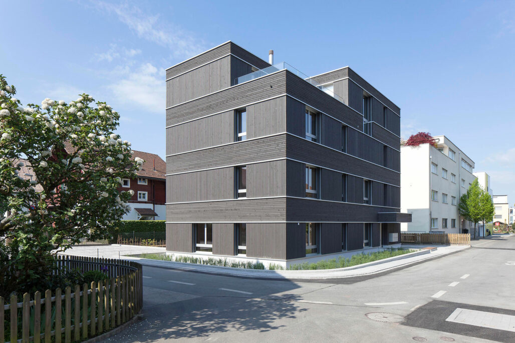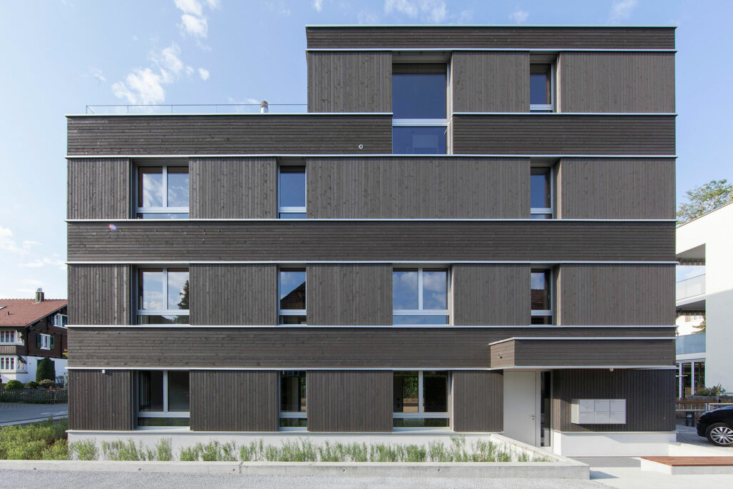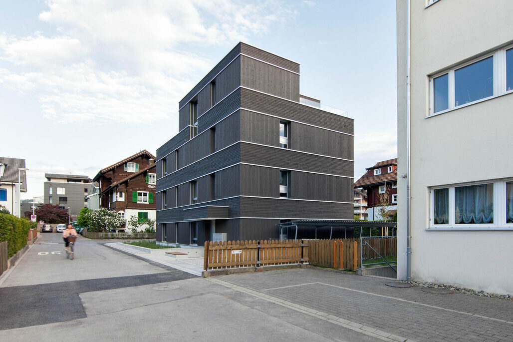 Die differenziert gestaltete Holzfassade verankert das Gebäude in der vorhandenen Quartierstruktur, mit vorwiegend Einfamilienhäusern, häufig im Chaletstil. Das tiefergelegte Erdgeschossniveau ist einer Höhenbeschränkung geschuldet. Die Umgebungsgestaltung sichert die Privatsphäre der Erdgeschosswohnung durch einen Pflanzkörper aus Zwergweiden. Dieser Pflanzbereich dient gleichzeitig für die Filterung und örtliche Versickerung des Meteorabwassers.