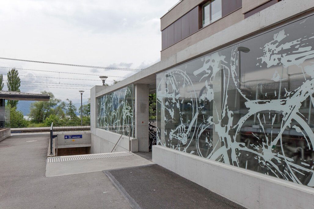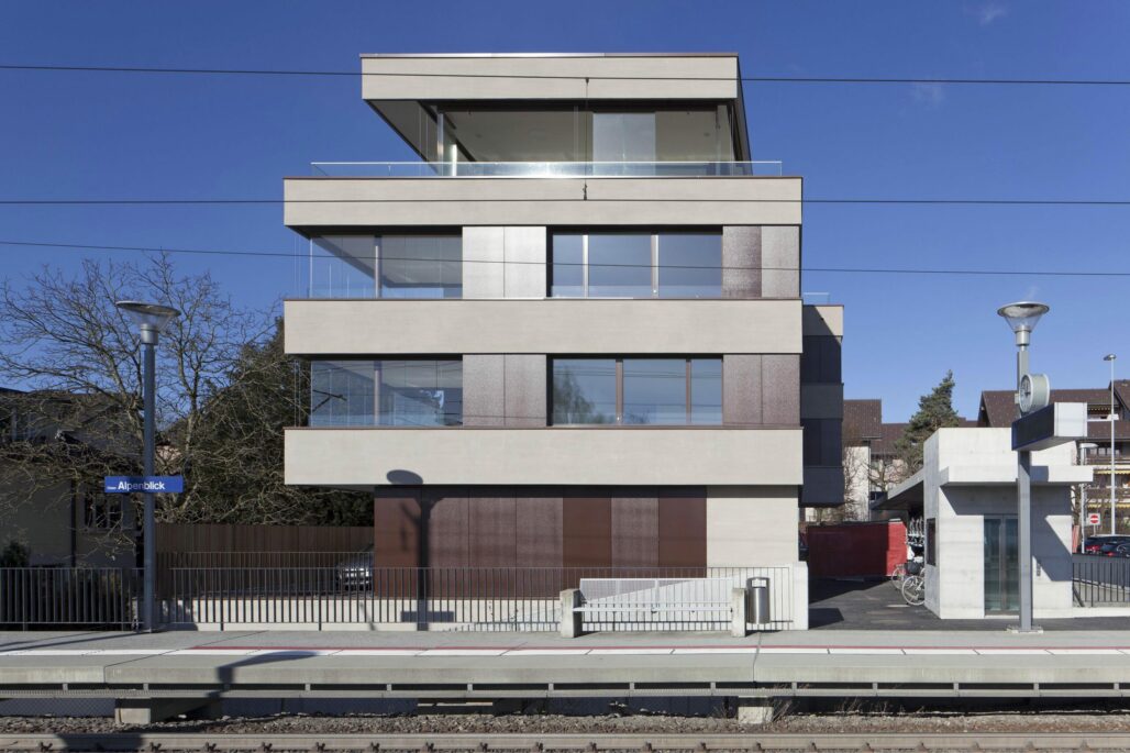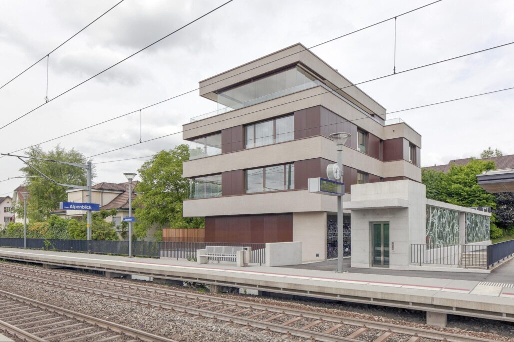 Der private Grundeigentümer und die Einwohnergemeinde Cham haben die Situation beim Zugang zur Stadtbahnhaltestelle gemeinsam und grundstücksübergreifend neu geplant. Das Anliegen der Gemeinde bestand vor allem darin, ebenerdig die dringend nötigen Veloparkplätze für die Kunden der Stadtbahn zur Verfügung stellen zu können. In den oberen Geschossen des Gebäudes befinden sich zwei Wohnungen. Die umlaufenden Putz- und Glasbänder fassen die auskragenden Balkone und Erker zu einem kräftigen Volumen, welches am durch den Verkehr geprägten Ort den nötigen Stand hat.
