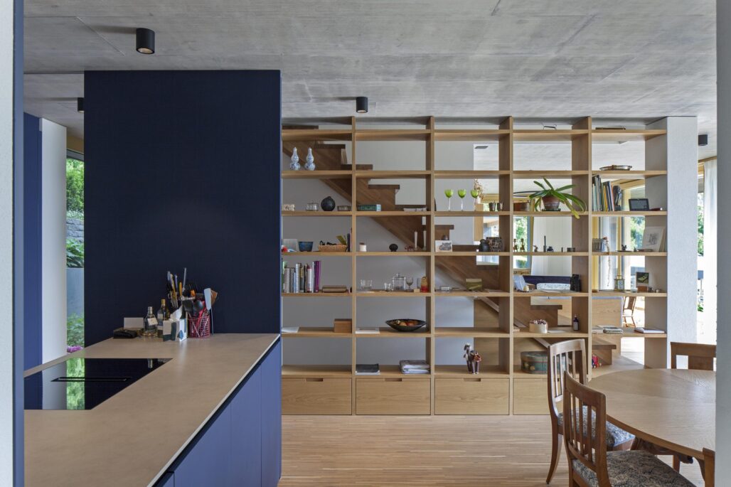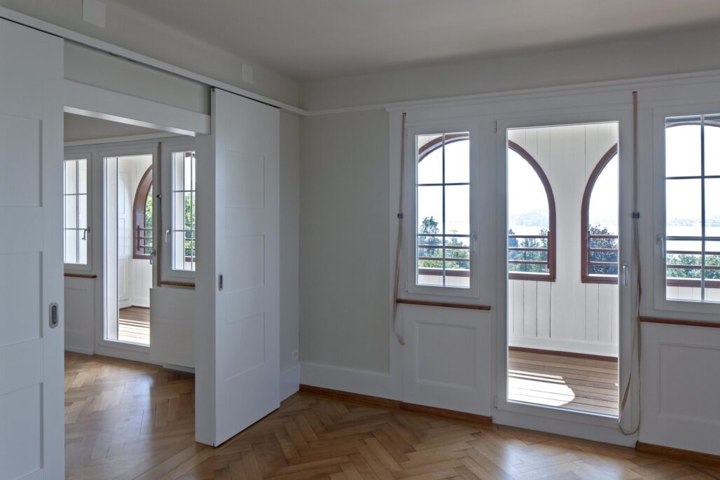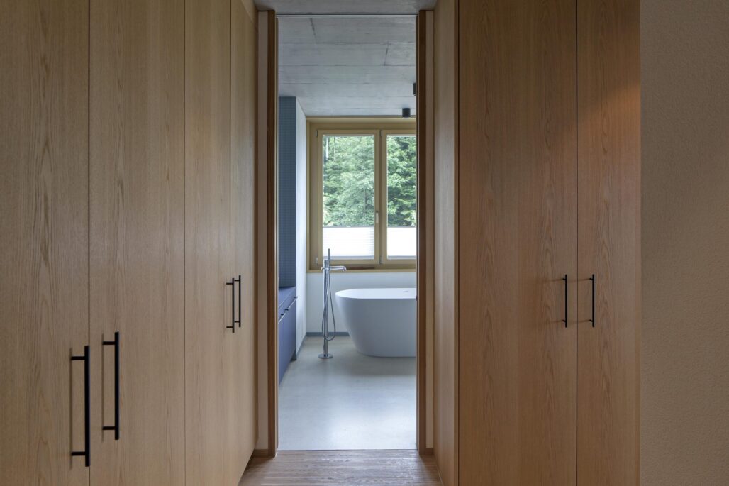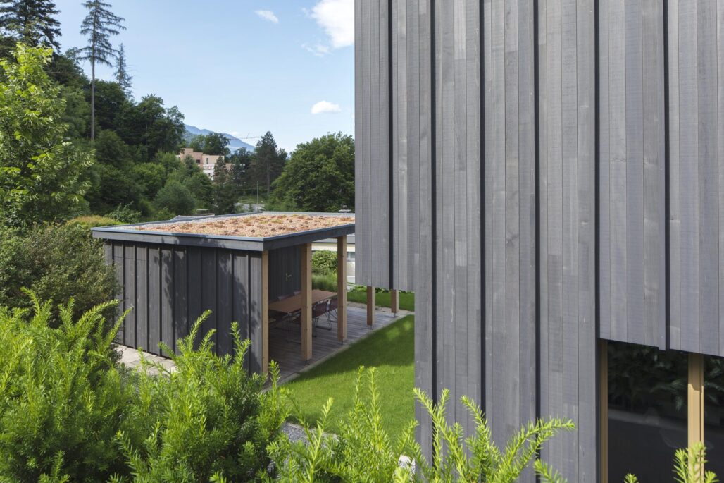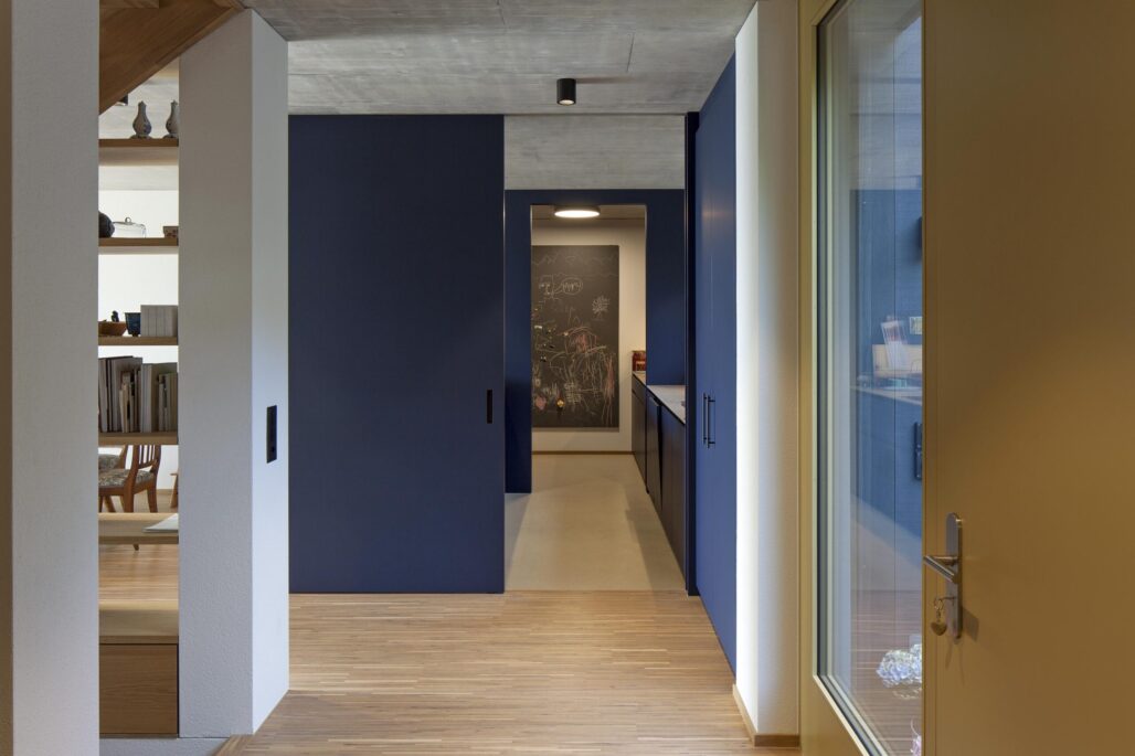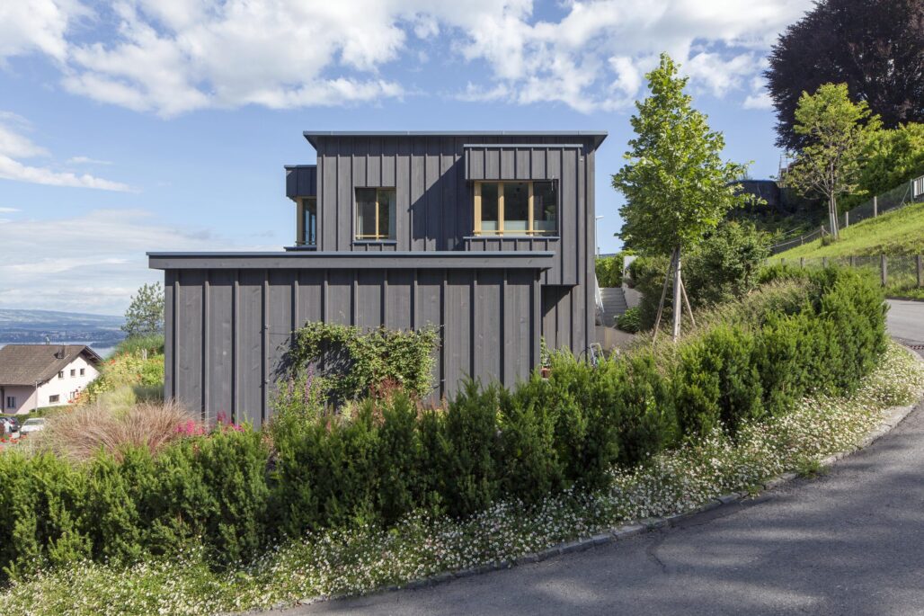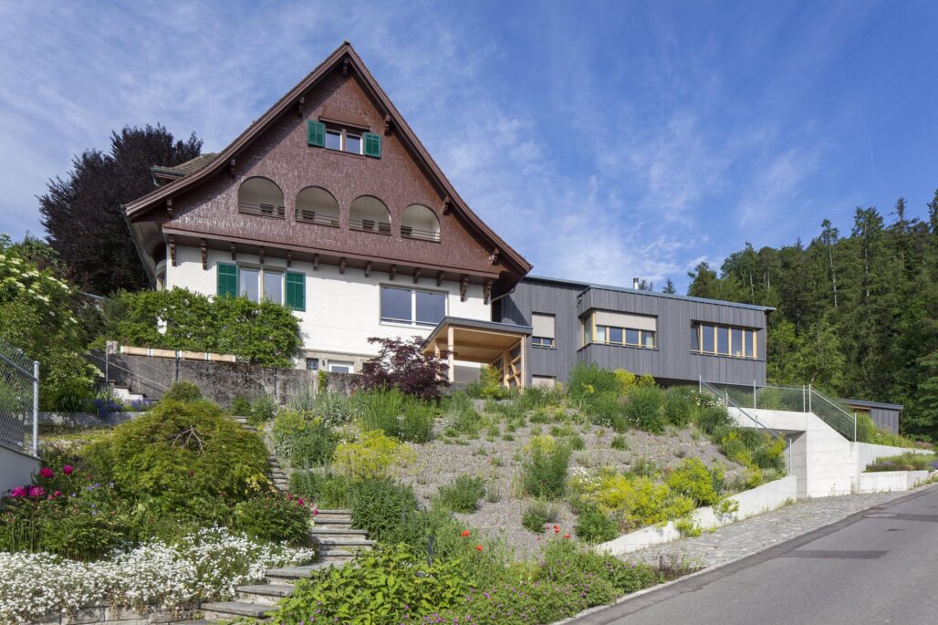 Der markante Ursprungsbau wurde um einen zurückhaltenden und im Ausdruck bescheidenen Anbau ergänzt. Die ursprünglich von einer Grossfamilie bewohnte Liegenschaft besitzt nun drei Wohneinheiten mit individuellen Aussenbereichen und einem grossen Gemeinschaftsgarten. Die Innenräume im Bestand sind geprägt von zeittypischen Ausbauten aus Holz, welche sorgfältig renoviert und für die nächste Nutzungsperiode vorbereitet wurden. Für den Einbau der beiden neuen Wohneinheiten waren nur wenige punktuelle Eingriffe notwendig. Im Anbau wiederum wird eine Raumfolge etabliert, welche sich aus der Hanglage und der aussergewöhnlichen Aussicht ergibt.