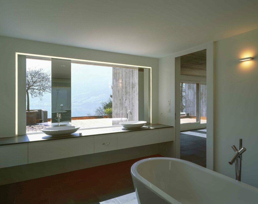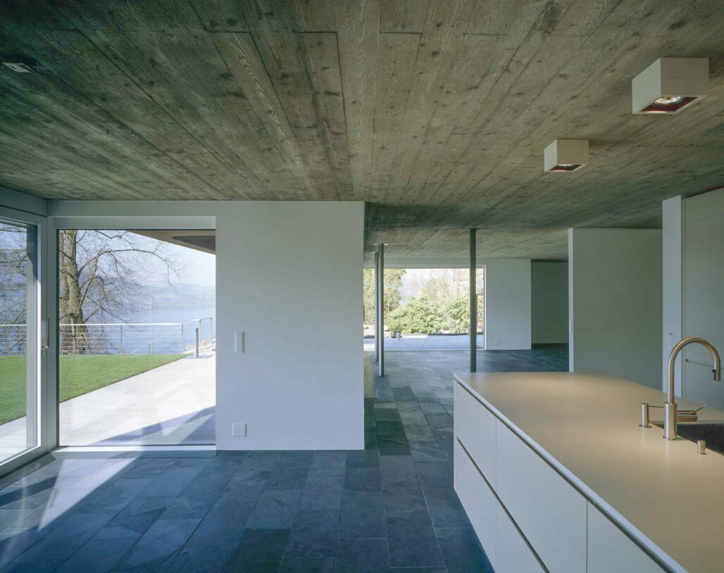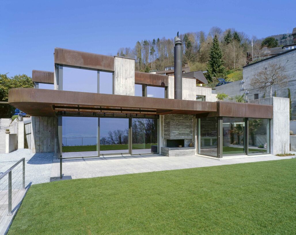 Das an steiler Hanglage in Walchwil liegende, grosszügige Einfamilienhaus zeichnet sich durch seine konsequent gestaltete und zeittypische Architektur der frühen 70er Jahre aus. Die mit schmalen vertikalen Brettern geschalten Sichtbetonwände und die Sturzverkleidungen aus patiniertem Cortenblech geben dem leicht terrassierten Gebäude seine eigene Gestalt. Die Sichtbetondecken setzten diese Materialisierung auch im Inneren fort. Mit dem Umbau werden die zeitgemässen Wohnbedürfnisse umgesetzt ohne die Qualitäten des vorhandenen Baus zu zerstören. Die Formensprache setzt sich auch im anschliessenden, ebenfalls terrassierten Garten fort und lassen Haus und Umgebung zu einem stimmigen Ganzen werden.