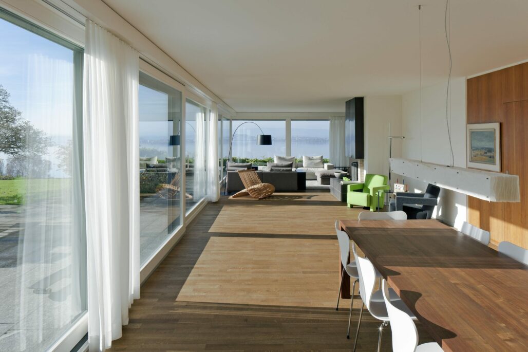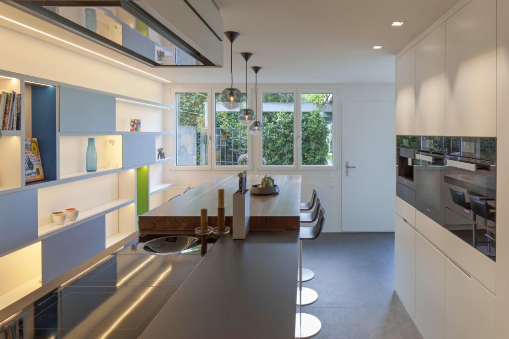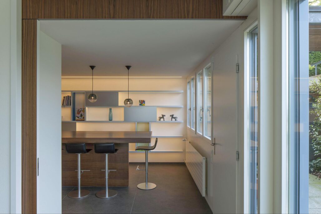 Das elegante Einfamilienhaus aus den Sechzigerjahren wurde von der nächsten Generation in Besitz genommen. Neben einer sanften Sanierung der Oberflächen wurde insbesondere die ursprünglich abgeschlossene Küche zum Wohnzimmer hin geöffnet und mit einer zeitgemässen Einrichtung ausgestattet. Der Eingriff führt zu einem fliessenden Raumgefüge im Wohngeschoss und entspricht damit besser dem Wohnbedürfnis der jungen Familie.