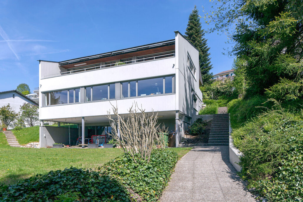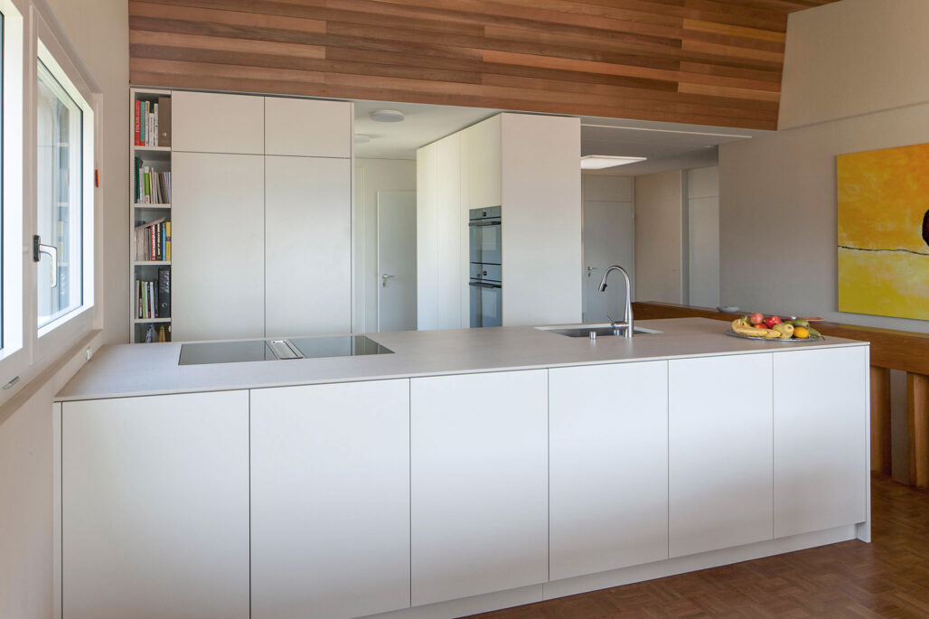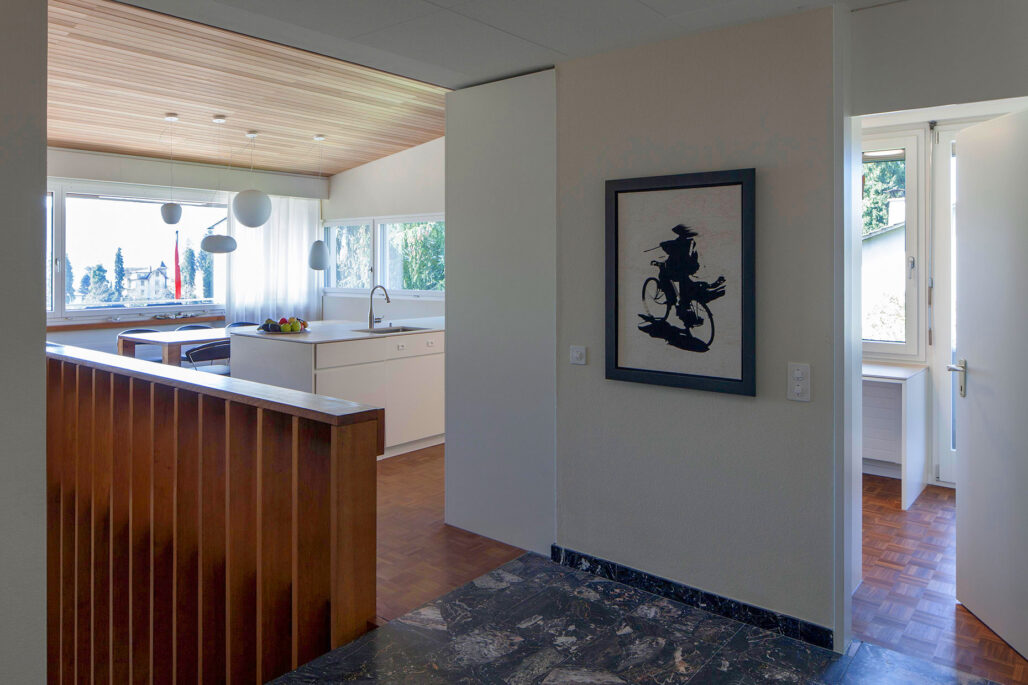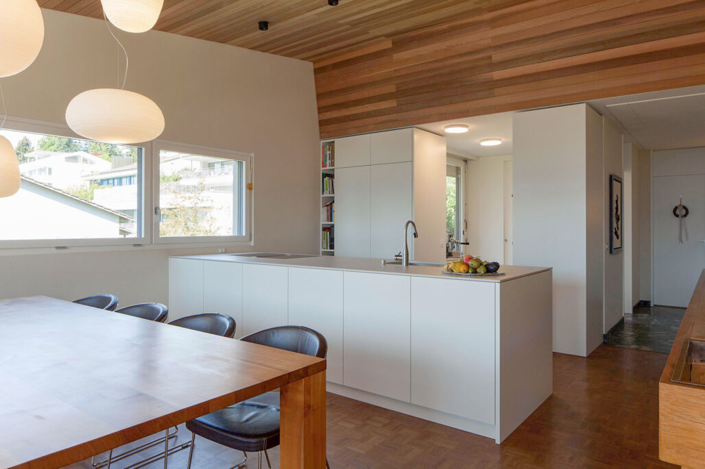 Das Einfamilienhaus aus den Sechzigerjahren musste den zeitgemässen Wohnbedürfnisse der nächsten Generation angepasst werden. Mit punktuellen Eingriffen konnte die hohe Qualität der Architektur erhalten bleiben. Zwei präzise gesetzte neue Bandfenster in den seitlichen Schotten bringen wie gewünscht mehr natürliches Licht ins Gebäudeinnere. Das Öffnen der Decke und Verkleiden mit Zedernholz im Koch-Essbereich wie im Wohnzimmer verbindet das ganze Wohngeschoss zu einem fliessenden Raum. Die sanfte Sanierung der Oberflächen, neue Bäder und eine zum Essbereich offene Küche aus den Sechzigerjahren vervollständigen den Umbau.