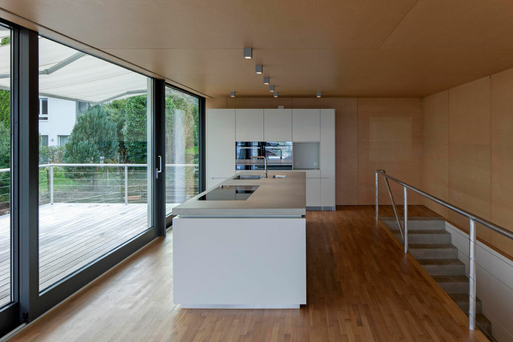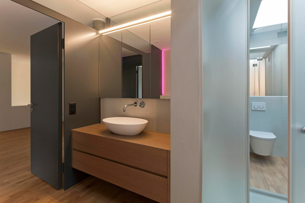 Die nach wie vor vorhandenen Qualitäten galt es zu erhalten, bzw. weiterzuführen. Bei der Sanierung der Nasszellen wurde der raffinierte Zugang von zwei Seiten in die Dusche zur Platzoptimierung erhalten. Der bestehende raumhohe Küchenblock im Dachgeschoss wurde durch eine Kochinsel ersetzt. So wird der Attikageschossraum stärker als ganzer Raum erlebbar und das Treppenauge erhält mehr natürliches Licht. Die bestehende Materialisierung wurde aufgefrischt und wo nötig ergänzt sowie neue Materialien möglichst sparsam eingesetzt. Dieser Eingriff soll nach der Umsetzung nicht als nachträglich wahrgenommen werden.