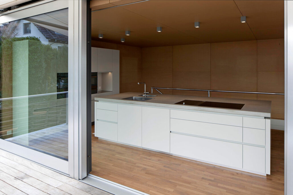 Das Eckhaus der vier Reihenhäuser an der Langholzstrasse in Hünenberg wurde in den 1990er Jahren vom Architekten Philipp Brühwiler geplant. Nach einem Eigentümerwechsel galt es, das bestehende Haus sanft zu erneuern und Bad und Küche zu ersetzen.
