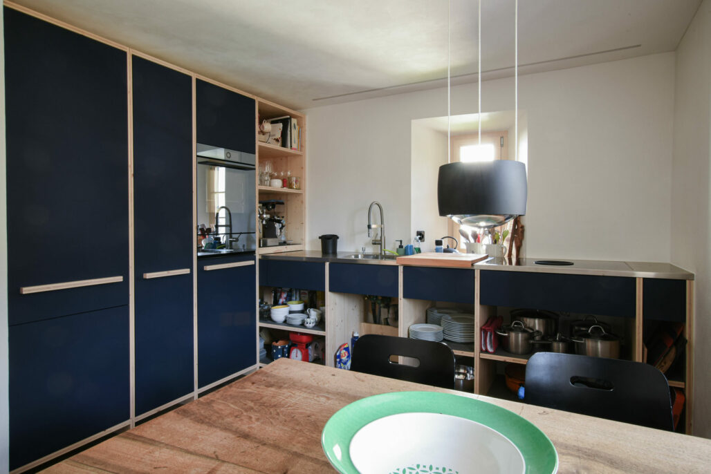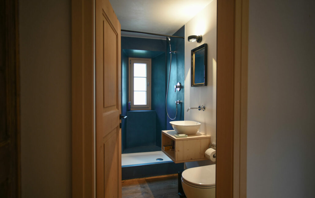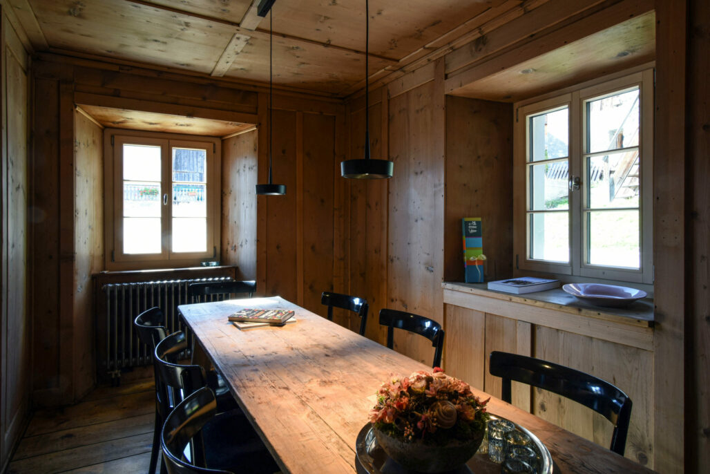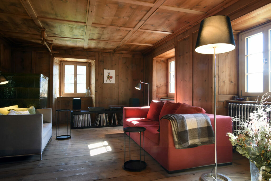 Nach dem Dorfbrand von 1864 wurde die gesamte nördliche Dorfhälfte von Riom in einem orthogonalen System neu aufgebaut. An der Hauptstrasse befinden sich die massiven Wohnhäuser, bergseitig die dazugehörenden Ställe. Beim Umbau wurden die im Laufe der Zeit dazugekommen Oberflächen zurückgebaut und möglichst viel der originalen Substanz freigelegt. Zwei neue Bäder und eine neue Küche wurden in die bestehende Raumstruktur eingebaut.