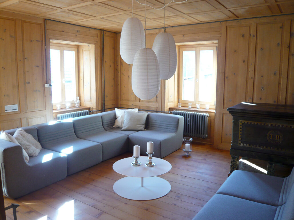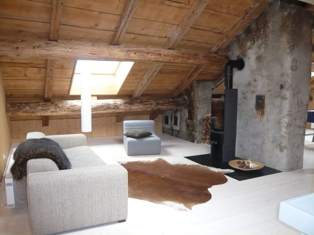 Das aus dem Jahr 1896 stammende ehemalige Bauernhaus für zwei Familien sollte in Ferienhaus umgebaut werden. Durch minimale Strukturveränderungen entstand pro Wohnung jeweils eine grosszügige Wohnküche. Durch das schichtweise Entfernen nachträglich eingebauter Materialien und Bauteile konnte der ursprüngliche gute Zustand der Struktur und der Oberflächen wieder sicht- und erlebbar gemacht werden. Für den Substanzerhalt und eine energetische Optimerung wurde das Dach erneuert und wärmegedämmt. In Zusammenarbeit mit den lokalen, mit dem traditionellen Handwerk vertrauten Unternehmern, wurde die Fassade mit für die Region typischen, feingliedrigen Zierelementen und einem Glattputz saniert.