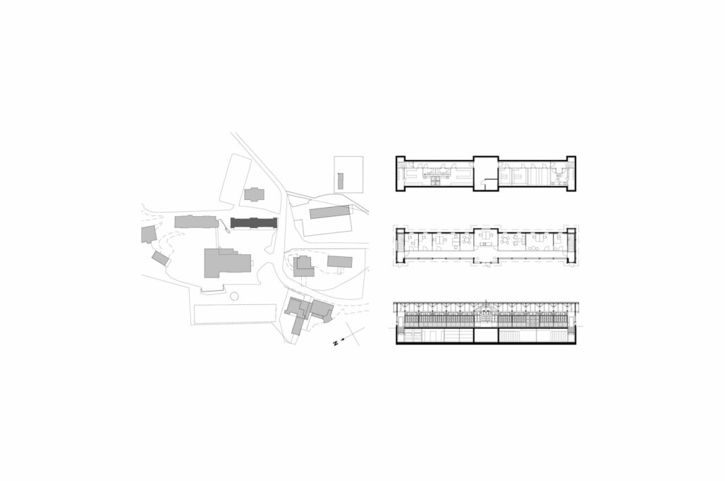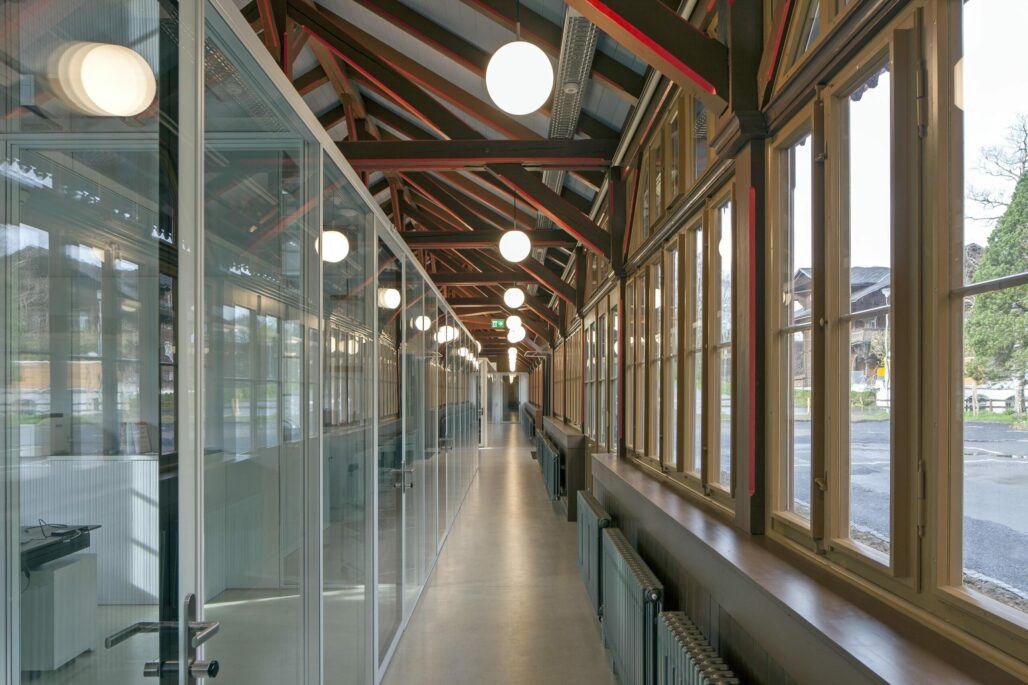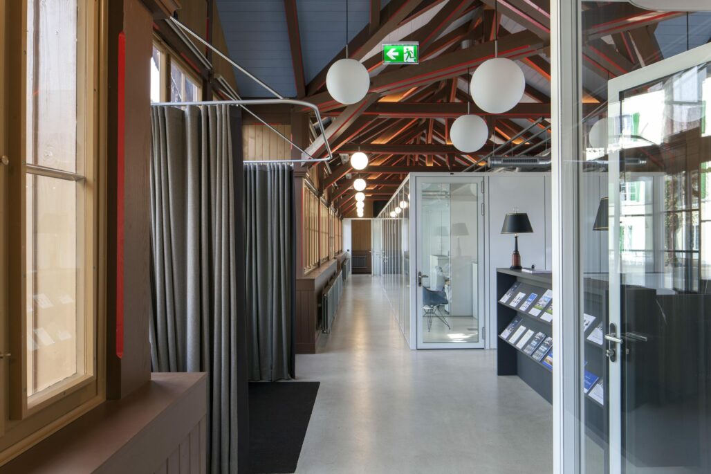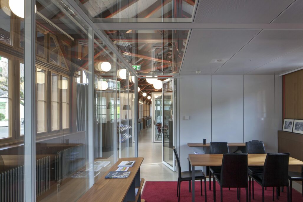Neu dient die Trinkhalle als sgn. «Welcome Center» der Schule mit Büros und Sitzungszimmern. Die einzelnen Räume werden als Büroboxen in die offene Halle gestellt. Konstruktiv können die Einbauten wieder demontierbar werden, wenn die Trinkhalle künftig einer anderen Nutzung zugeführt werden sollte. Das Projekt lebt von der Spannung zwischen der historischen Substanz und den modernen Einbauten.