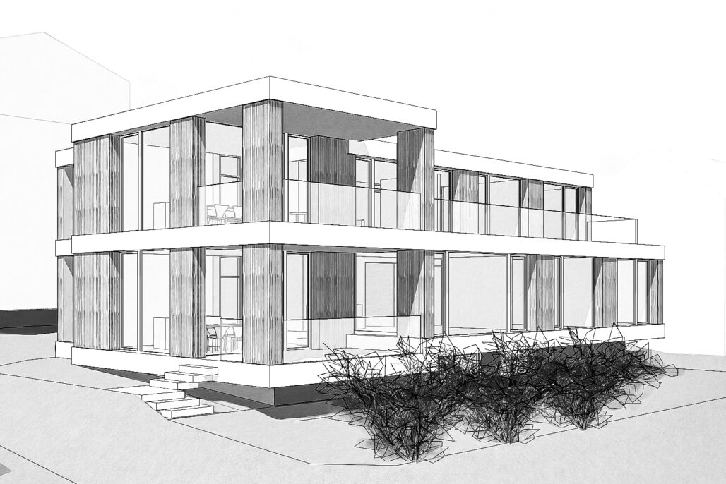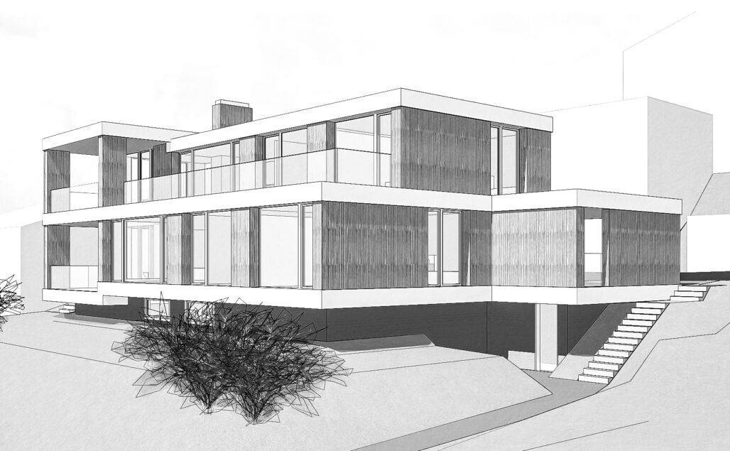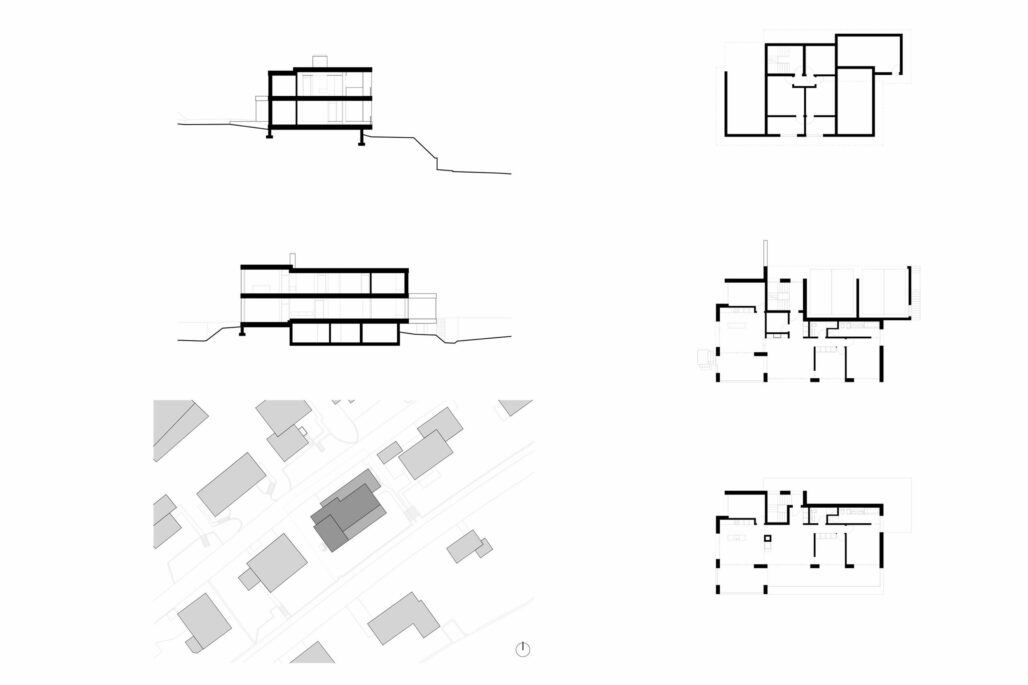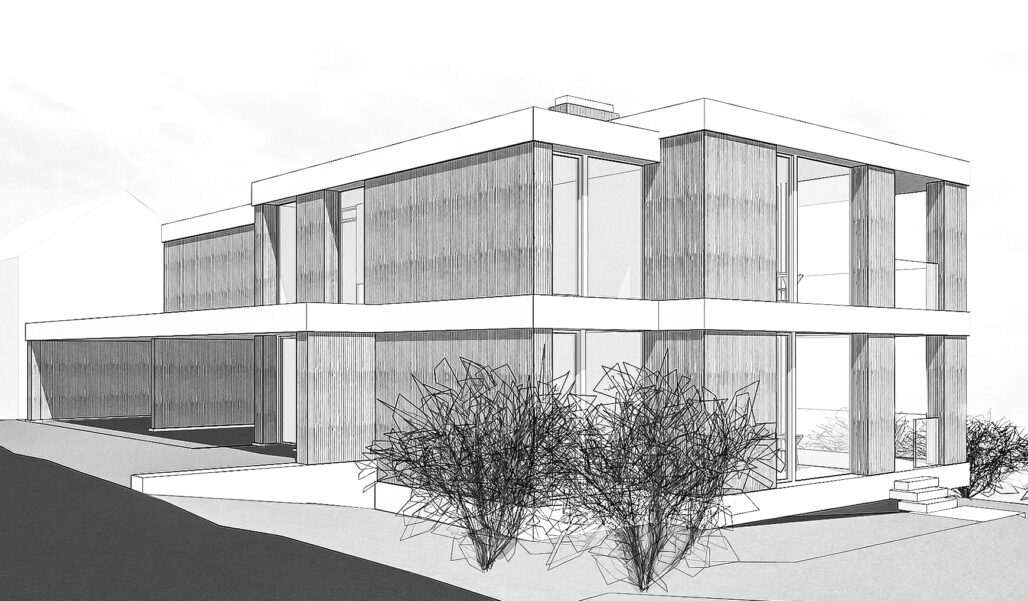 An schöner Hanglage mit Sicht auf den Zugersee und die Rigi sollen 2 gleichwertige Wohneinheiten entstehen. Die Parzelle ist oben und unten von einer Quartierstrasse und seitlich von heterogenen Einfamilienhäusern umgeben. Das Volumen öffnet sich nach Süden und zum See hin. Während sich das Erdgeschoss um die Parkplätze organisiert und den Garten als Aussenraum hat, ist das obere Geschoss zurückversetzt, was einerseits die Parkplätze überdeckt und andererseits eine grosse Terrasse ermöglicht. Die Parkierung findet von oben statt, so fügt sich das Gebäude besser in die Umgebung ein als eine Zufahrt von unten.