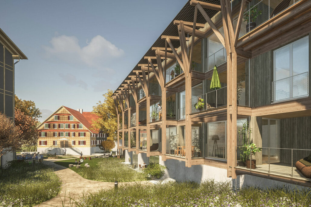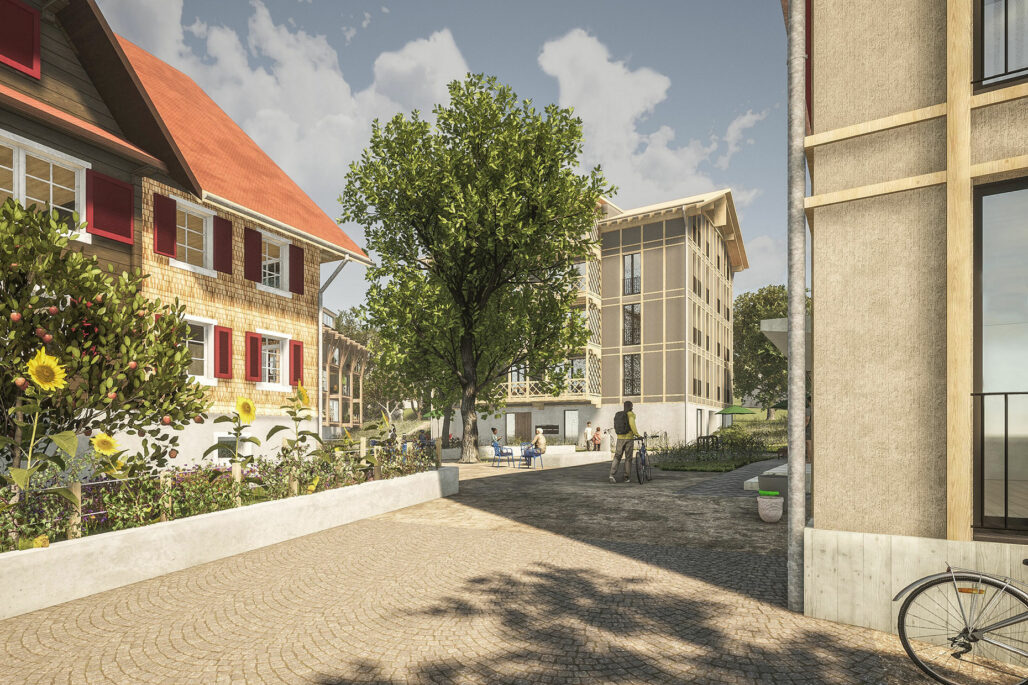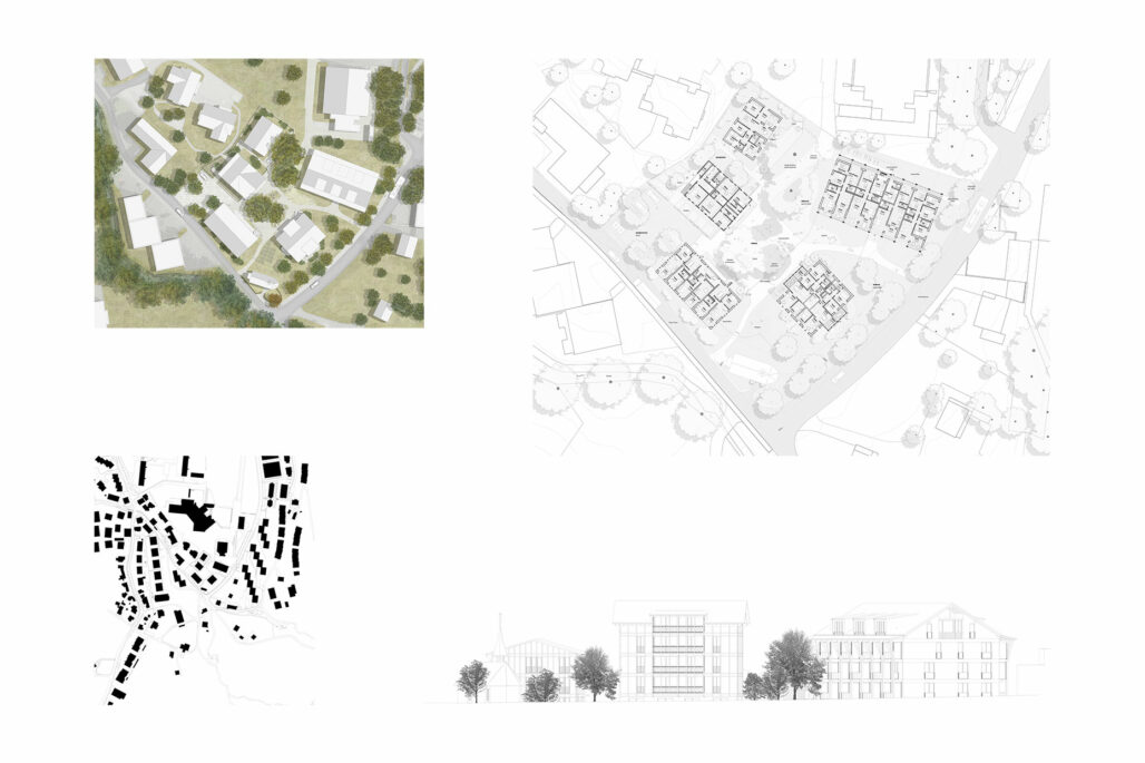 Die einzelnen Gebäude sind in ihrem Volumen und Ausdruck gewollt unterschiedlich und schaffen ein modernes Hofgebilde mit Wohnungen, welches sich gut in das bestehende Dorf einfügt. Die neuen Bauten nehmen immer Bezug auf die direkt umliegenden Gebäude, ihre spezifische Situation und gehen damit auf diesen sensiblen Ort ein. Es wird eine sehr differenzierter Wohnungsmix mit insgesamt 41 Wohnungen und eine Einstellhalle mit 40 Parkplätzen vorgeschlagen. Dabei sind 2.5-5.5 Zimmer Geschoss- wie Maisonettwohnungen geplant – gewisse durchgesteckt, übereck oder über einen Laubengang erschlossen. Die Gebäude zeigen sich mit geschlossenen wie auch offenen Fassaden, mit Loggien aber auch vorgesetzten Balkonschichten, zudem besitzen alle Gebäude umgebungstypisch ein Steildach.