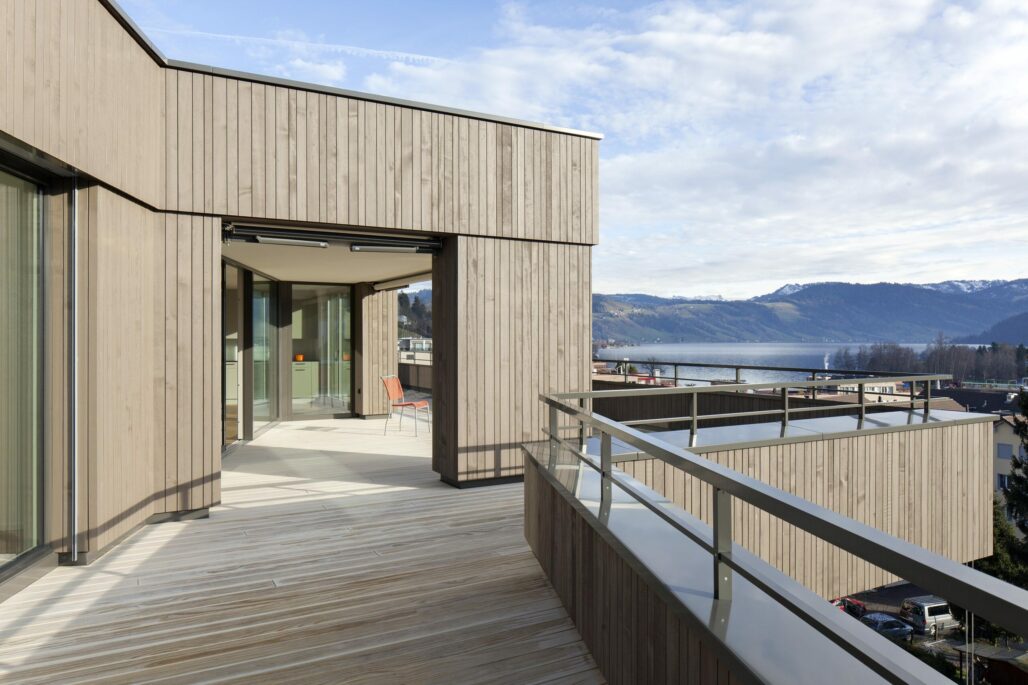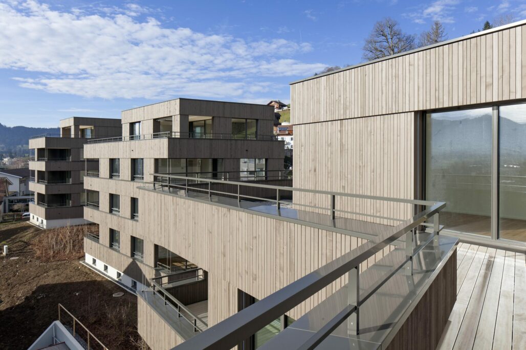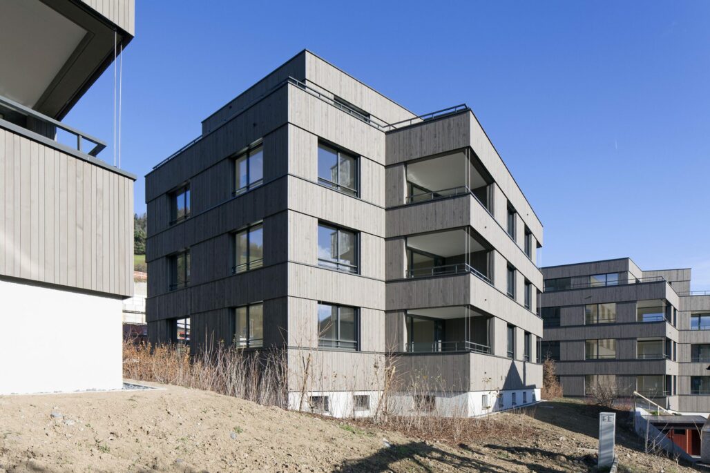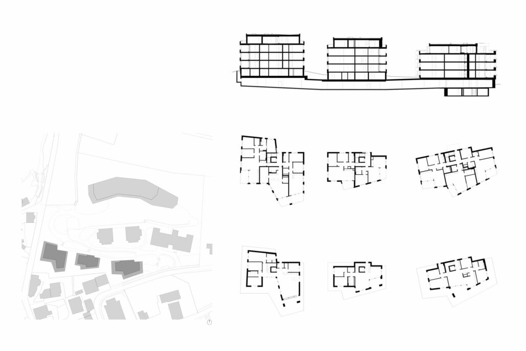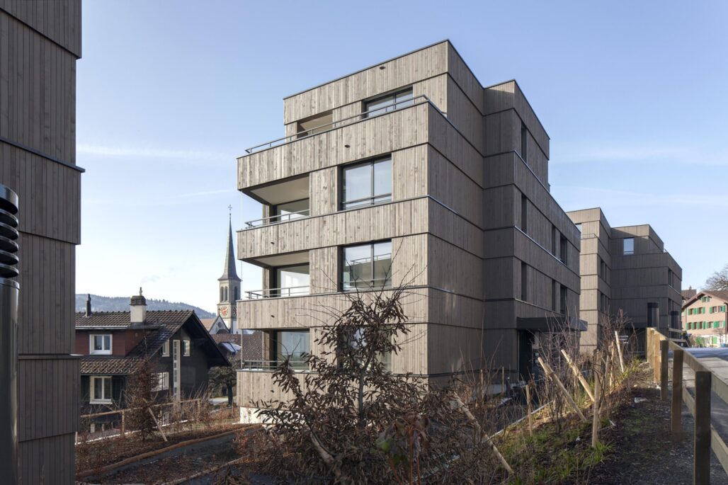 Die drei neuen Wohnhäuser an der Grenze zum Ortskern vermitteln zwischen dem Ortskern und dem Neubau der Altersresidenzwohnungen. Die geknickten und sorgfältig eingepassten Volumen und die gegliederte hinterlüftete Holzfassade nehmen den Massstab der kleinteiligen angrenzenden Bebauung auf. Über die Gliederung und Materialisierung der Fassadengestaltung verbinden sich die Häuser mit dem hangseitig gelegenen Altersresidenzwohnhaus.