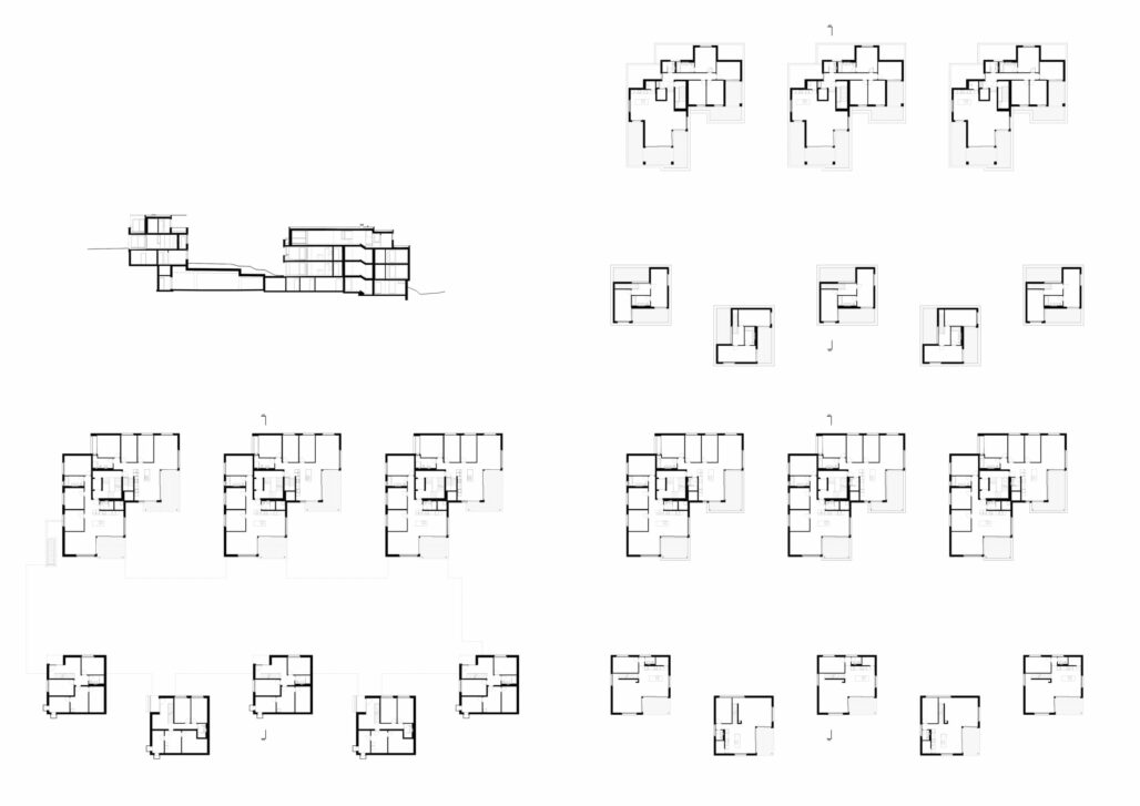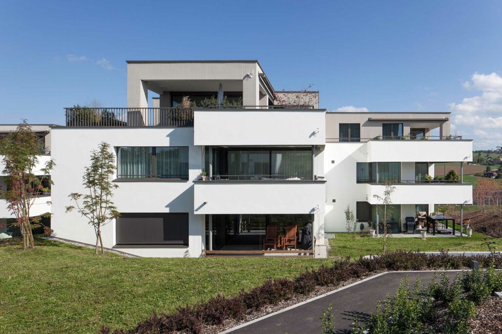 Die Situation liegt am Siedlungsrand von Knonau, die Grenzen des Grundstücks sind gleichzeitig die Übergänge zur Landwirtschaftszone. Das Grundstück im Eschfeld weist mit fast 12 m über den ganzen Perimeter gemessen eine nicht zu unterschätzende Höhendifferenz auf. Die Besonnung von Süden ist optimal, die Abendsonne von Westen streicht über die sanfte Hügelkuppe des Eschfeld. Das Projekt setzt ein Konzept um, welches durch die Zonenplanung mit den beiden unterschiedlich dichten und hohen Bauzonen bereits angedacht ist: Eine dichtere Bebauung und Konzentration von Ausnutzung am Ostrand des Perimeters und die zunehmende Auflösung der Dichte gegen Westen. Die geplante Volumenverteilung ermöglicht eine weite räumliche Verschränkung des Freiraumes innerhalb der Siedlung mit der umliegenden Landwirtschaftszone. Die Geschosswohnungen in den Mehrfamilienhäusern weisen unterschiedliche Qualitäten auf. Pro Gebäude haben jeweils zwei Einheiten einen direkten Gartenbezug, zwei Wohnungen im Obergeschoss mehr Weitsicht. Zuoberst befinden sich die grosszügigen Wohnungen des Attikageschosses. Die freistehenden Einfamilienhäuser sind mit 6 1/2 Zimmer geplant und stehen unmittelbar an der Siedlungsgrenze. Die Anordnung und Ausrichtung der Mehrfamilienhäuser und der leichte Höhenversatz der beiden Gebäudeflügel ermöglicht eine Entflechtung der Aussenräume der Gartenwohnungen. Die unterschiedliche Ausrichtung und die versetzte Platzierung ergeben auch bei den Einfamilienhäuser Aussenräumen mit angemessener Privatheit.