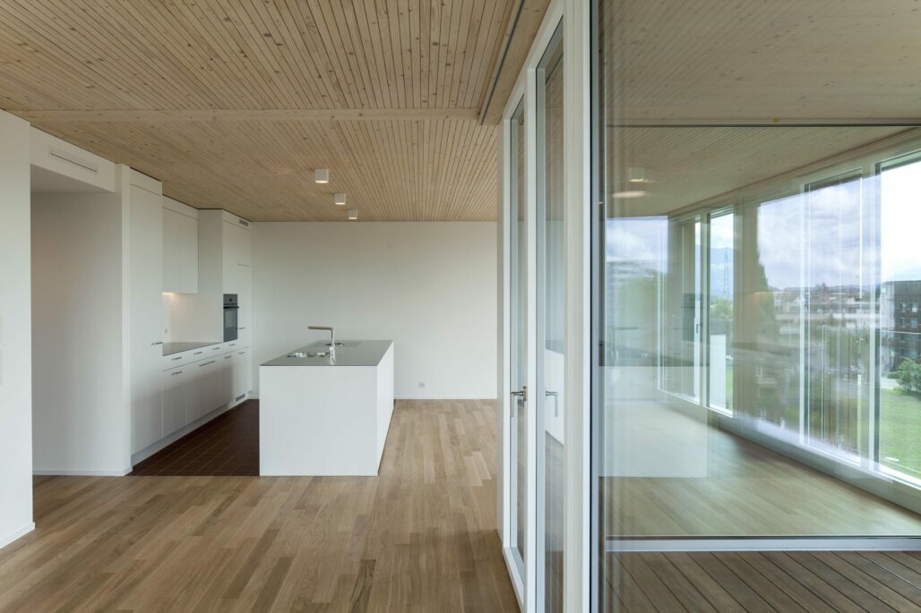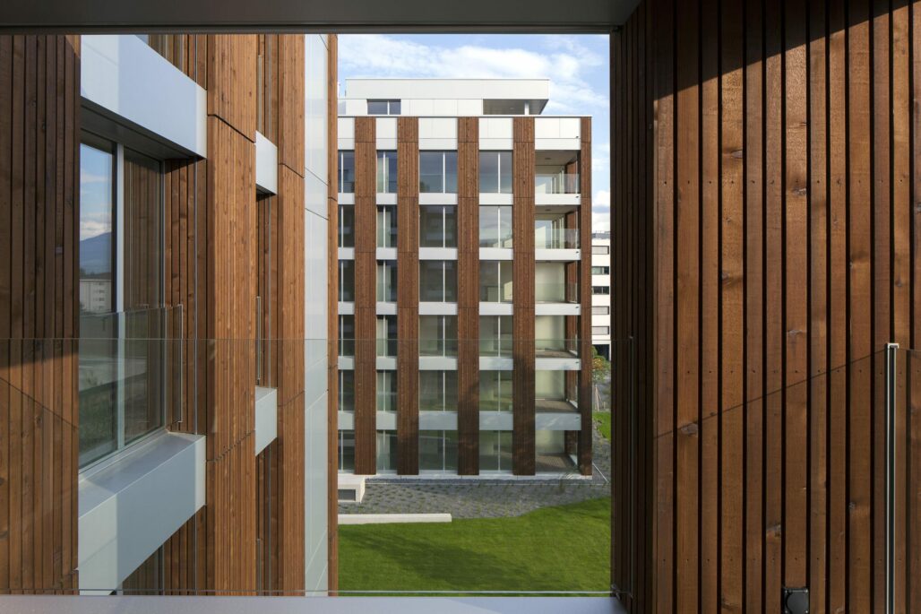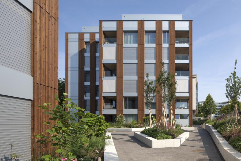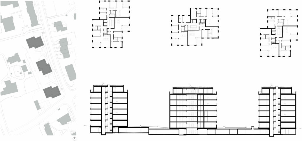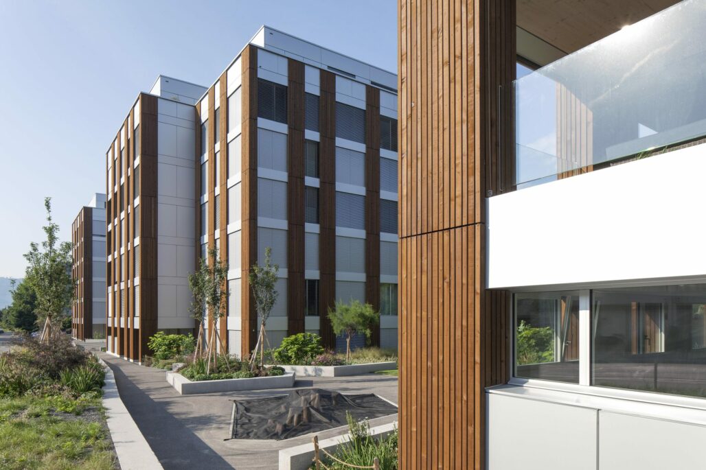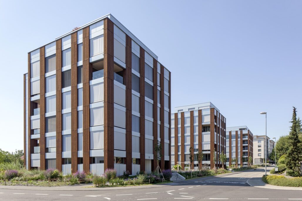 Drei kompakte, dreibündige und sechsgeschossige Gebäudekörper entlang der Hochwachtstrasse ergeben ein Maximum an nicht bebautem Aussenraum und Durchsicht in Ost-Westrichtung, gleichzeitig wird der bestehende Bebauungsrythmus bis ins Zentrum von Steinhausen weitergeführt. Die Hauseingänge orientieren sich zur Strasse. Die Neubauten stehen in der Wiese, einem grosszügigen Aussenraum welcher die neue Überbauung mit dem Gehöft Oele verbindet und beide Bebauungen bzw. deren Benutzer gleichermassen davon profitieren. Das scheinbare Paradox von urbanem Lebensgefühl in einer ländlichen Umgebung wird zur eigentlichen (Wohn-) Qualität der Überbauung. Mit der geplanten Bauweise als reiner siebengeschossiger Holzbau wird diese Haltung auch konstruktiv weiterverfolgt. Die einfachen und gut möblierbare Grundrisse mit klarer Trennung zwischen Wohnen- und Zimmerbereich entstehen aus den räumlichen Vorgaben und der Prämisse des Holzbaus abgeleiteten Struktur. Durch die Anordnung mit drei Wohnungen pro Geschoss ergibt mit 18 Wohnung pro Erschliessungskern ein optimiertes Verhältnis zwischen Erschliessungs- und Nutzfläche. Die vertikale und horizontale Gliederung der Fassaden erzeugt einen eigenständigen aufgeschlossenen Ausdruck. Die druckimprägnierte und unterhaltsfreie Holzfassade zeigt die Seele der Gebäude als Holzbauten auch nach aussen.