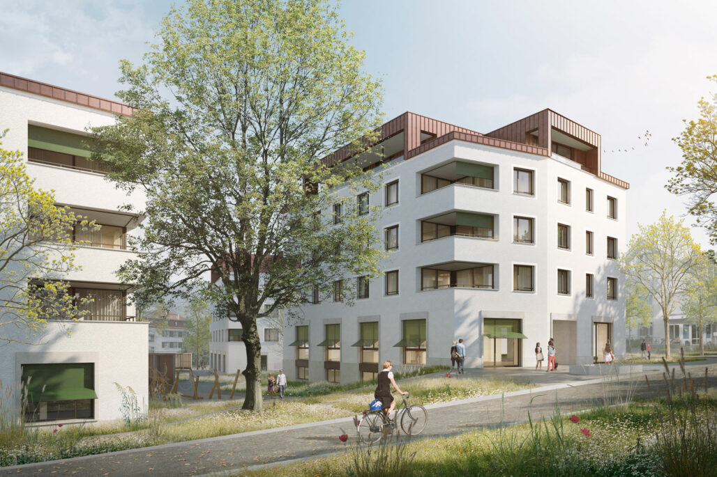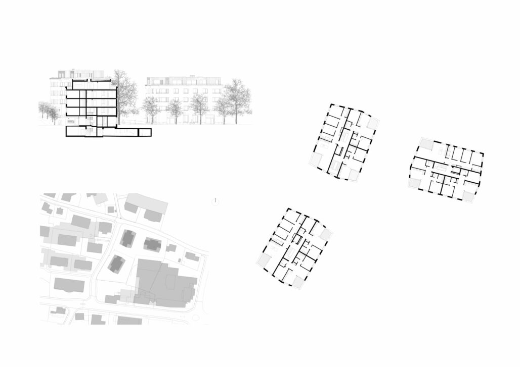 Die an der Nordgrenze entlang führende Alte Landstrasse prägt den Ort wesentlich, stellt als historischer Weg eine wichtige Verbindung dar und ist damit der öffentlichste Ort des Areals. Eine mächtige Stieleiche am Strassenrand verleiht diesem Ort eine besondere Ausstrahlung. Drei punktförmigen Gebäude entsprechen den unterschiedlichen öffentlichen Nutzungen, welche die jeweiligen Erdgeschosse besetzen: Wohnheim, Museum/Mehrzweckraum und Kindergarten. Die punktförmigen Bauten übernehmen die Masstäblichkeit und Körnung des Ortes. Die Komposition der Neubauten und Lage der Tiefgarage ermöglichen den Erhalt der vitalen und gesunden Stieleiche am Rand der Parzelle und Strassenrand der alten Landstrasse. Mit dem Bebauungsvorschlag kann der parkartige Charakter des Areals gewahrt werden, welcher zwischen den sehr heterogenen Teilen des Umfeldes vermittelt.