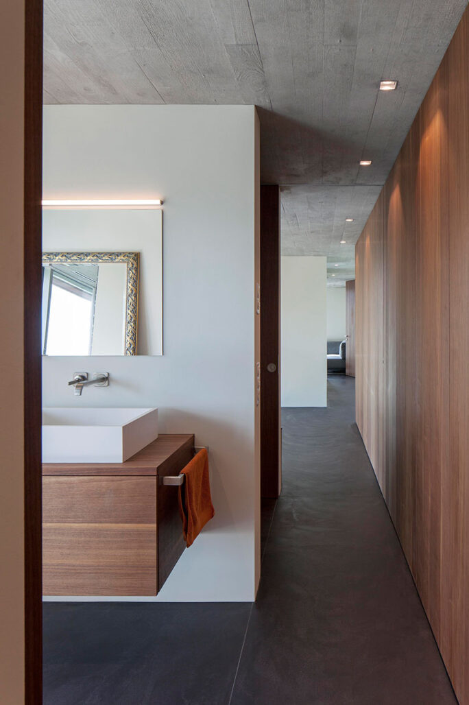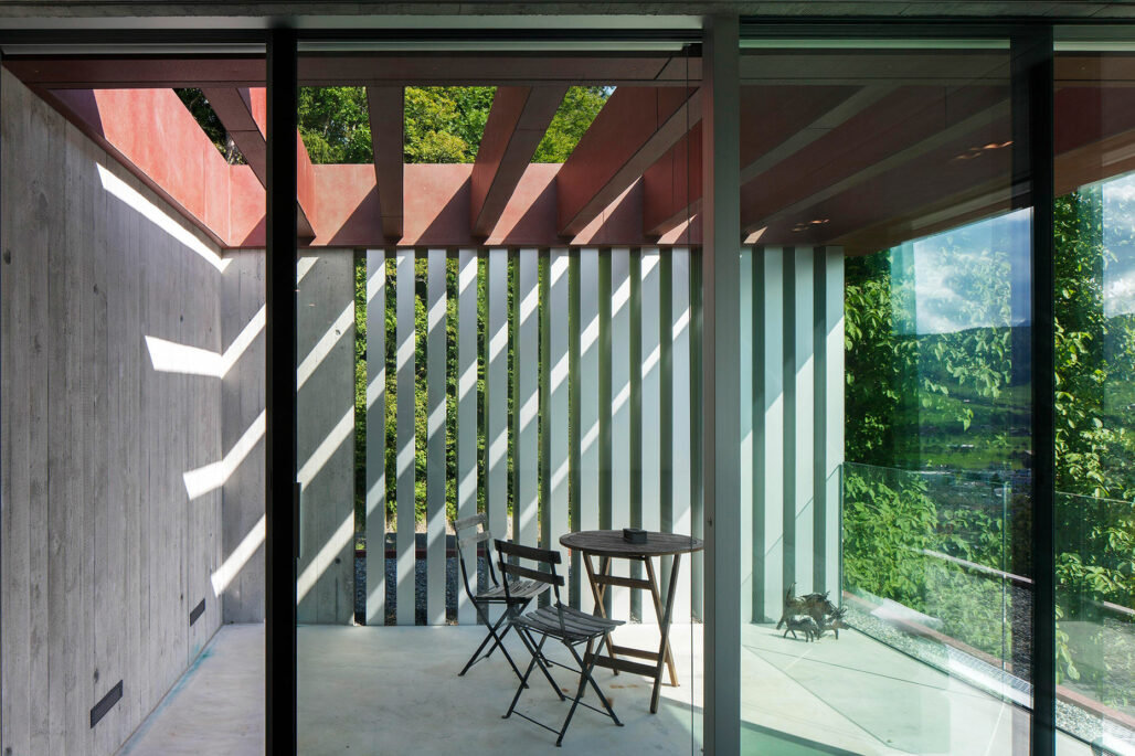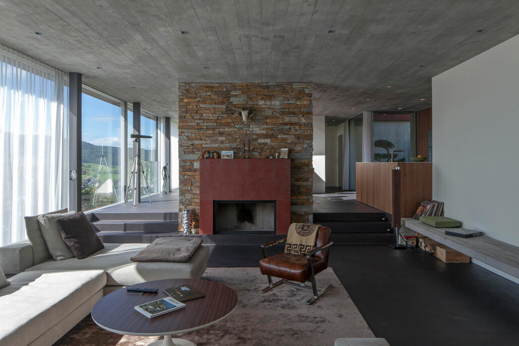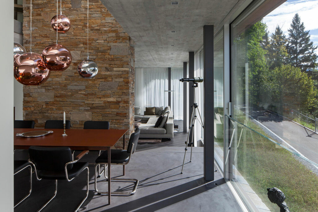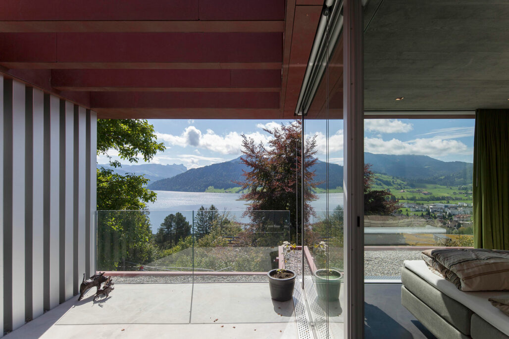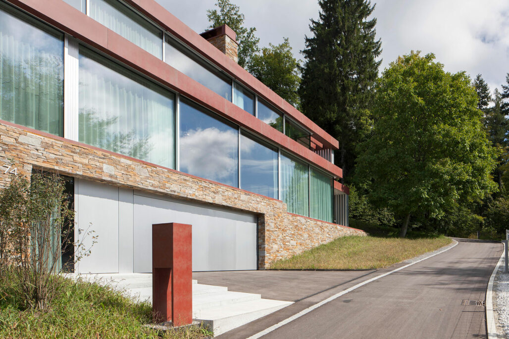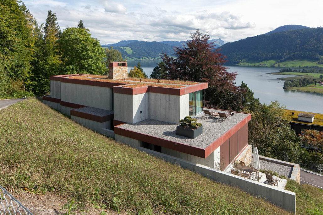 Am steilen Hang unterhalb der Klinik Adelheid entsteht das Haus am Höhenweg. Auf einem Sockel aus Natursteinen liegen die beiden Wohngeschosse. Die Decken sind von rostigem Stahl gerahmt. Das prächtige Panorama des Ägeritals bleibt stets präsent.