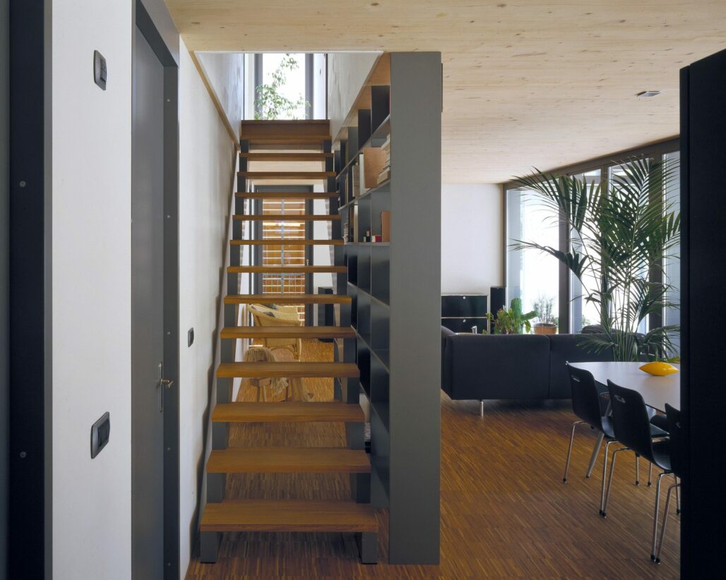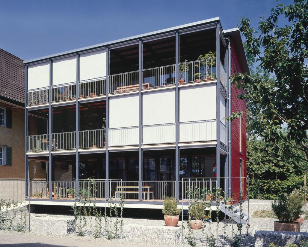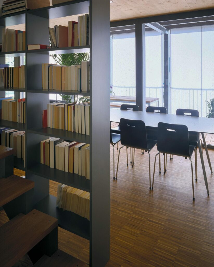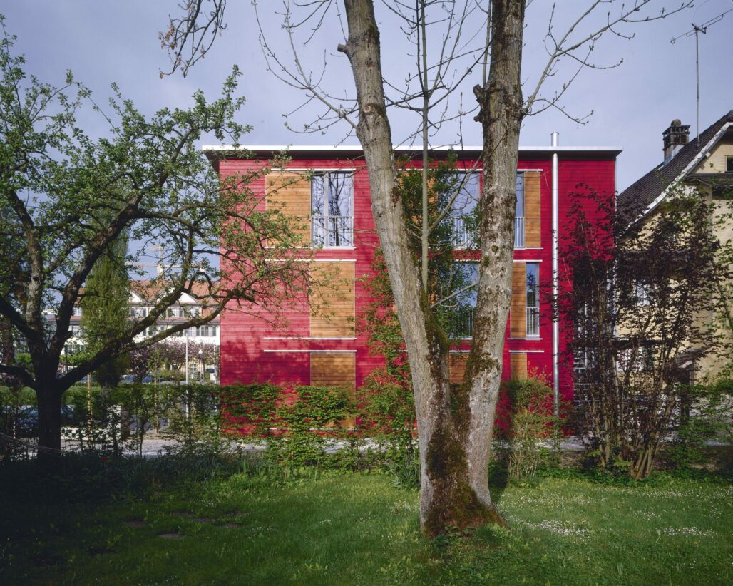 Der dreigeschossige Holzplattenbau an der Rigistrasse ist Ersatz für ein ehemaliges Garagengebäude. Die Ost-West-Orientierung des Grundrisses und die Anordnung der beiden Wohnungen über je anderthalb Geschosse ermöglicht die Gleichwertigkeit der unteren und der oberen Wohnung und minimiert die Zirkulationsflächen. Sturzlose Türen verwischen die Grenzen von Raum zu Raum, raumhohe Fenster verbinden den Innen- und Aussenraum. Eine durchgehende Veranda auf der Westseite ergänzt die angrenzenden Zimmer um einen wertvollen Aussenbereich. Je nach dem, ob die sich auf der Aussenseite der Veranda befindenden Stoffstoren offen oder geschlossen sind, wird die Veranda ein Teil des Innenraumes oder das Wohnzimmer ein Teil des Aussenraums.