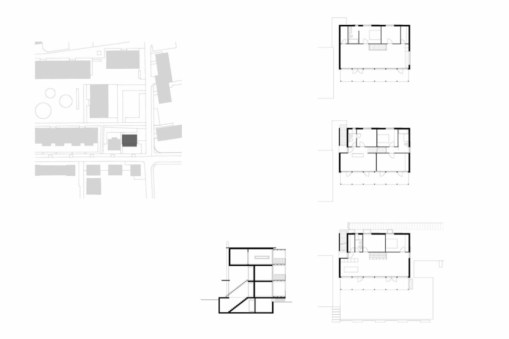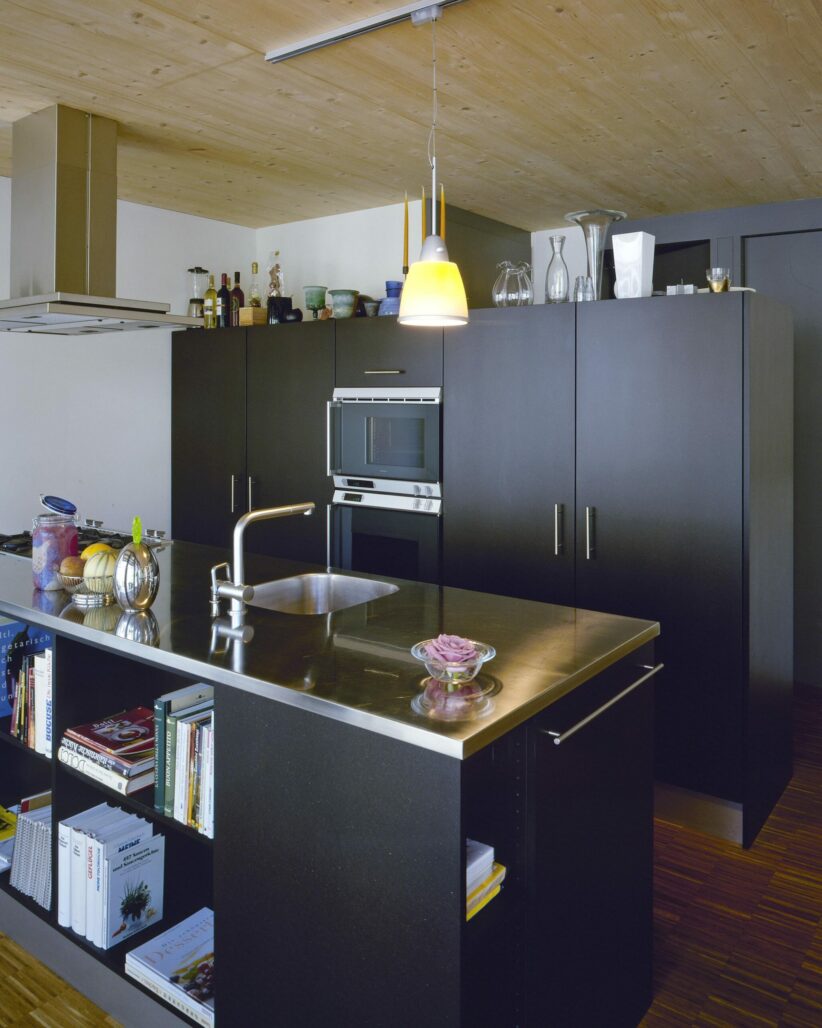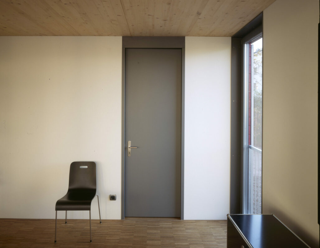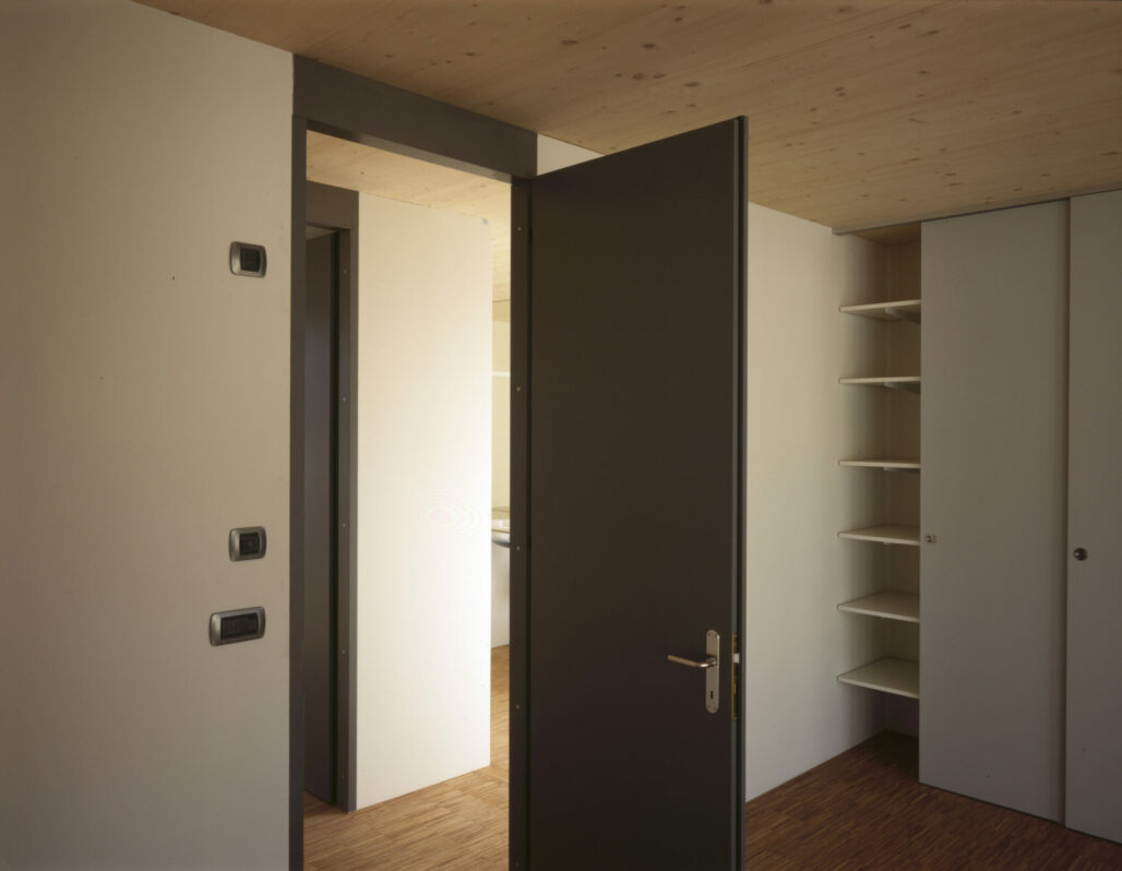Der dreigeschossige Holzplattenbau an der Rigistrasse ist Ersatz für ein ehemaliges Garagengebäude. Die Ost-West-Orientierung des Grundrisses und die Anordnung der beiden Wohnungen über je anderthalb Geschosse ermöglicht die Gleichwertigkeit der unteren und der oberen Wohnung und minimiert die Zirkulationsflächen. Sturzlose Türen verwischen die Grenzen von Raum zu Raum, raumhohe Fenster verbinden den Innen- und Aussenraum. Eine durchgehende Veranda auf der Westseite ergänzt die angrenzenden Zimmer um einen wertvollen Aussenbereich. Je nach dem, ob die sich auf der Aussenseite der Veranda befindenden Stoffstoren offen oder geschlossen sind, wird die Veranda ein Teil des Innenraumes oder das Wohnzimmer ein Teil des Aussenraums.